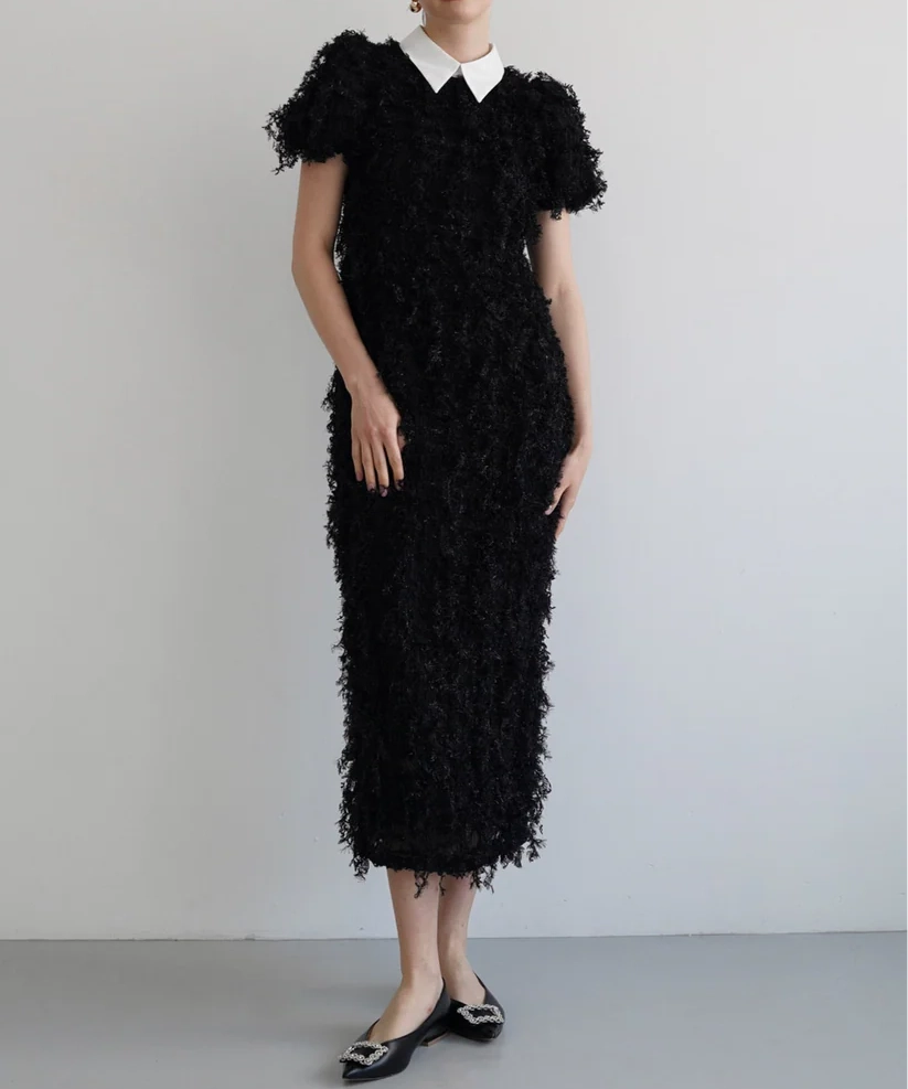 【2サイズ】Back Satin Crepe Georgette Embroidered Cuffs I-Line Dress - black