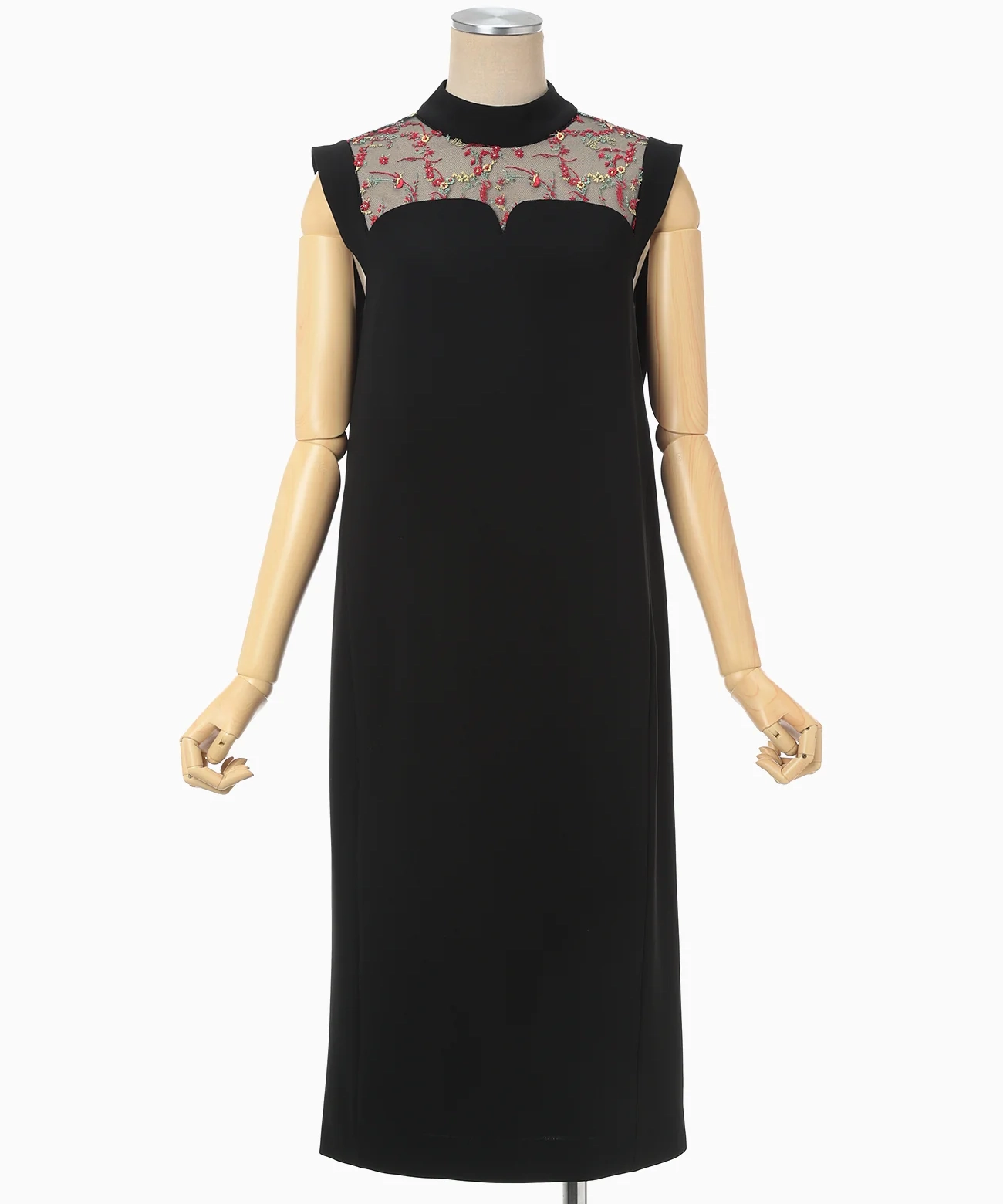 【3サイズ】Triacetate Georgette Embroidered Cuffs I-Line Dress - black