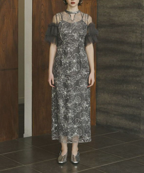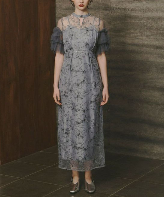 【2サイズ】Triacetate Floral Embroidery DRESS