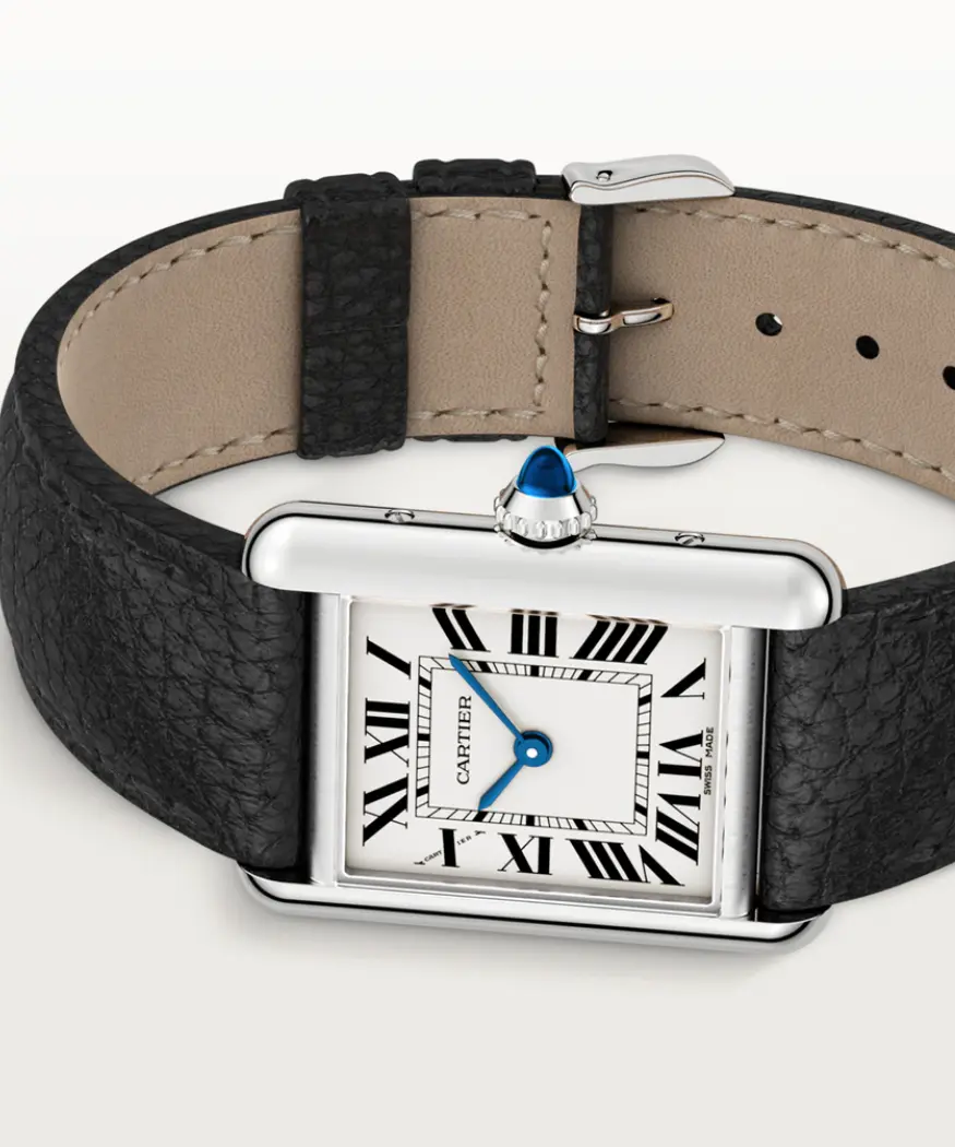 タンク マスト ウォッチ、SM、クォーツムーブメント。スティール製ケース、パール状の飾り付きリューズにカボションシェイプ シンセティック スピネル、シルバーダイアル、ブルースティール製剣型針、グレイン仕上げブラックカーフスキンストラップ、スティール製アルディロンバックル。ケースサイズ:29.5 mm x 22 mm、厚さ:6.6 mm。日常生活防水。