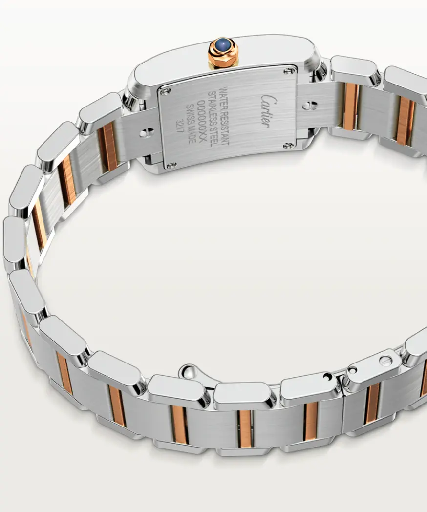 タンク フランセーズ ウォッチ、SM、クォーツムーブメント。スティール製ケース、イエローゴールド製の八角形のリューズにシンセティック カボションシェイプ スピネル、シルバー仕上げグレイン ダイアル、ブルースティール製剣型針、サファイア クリスタル、ツートーンのブレスレット。ケースサイズ:25 mm x 20 mm、厚さ:6.15 mm、日常生活防水。