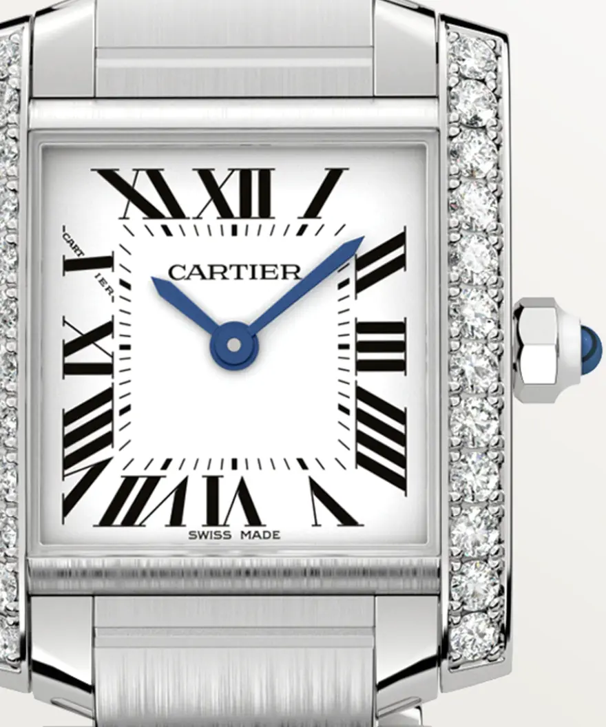 タンク フランセーズ ウォッチ、SM、クォーツムーブメント。スティール製ケースにブリリアントカット ダイヤモンド24個(0.49ct)。ファセットを施したリューズにシンセティック スピネル、シルバー仕上げダイアル、ブルースティール製剣型針、サファイアクリスタル、スティール製ブレスレット、ケースサイズ:25mm x 20mm、厚さ:6.15mm、日常生活防水。