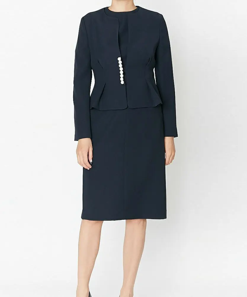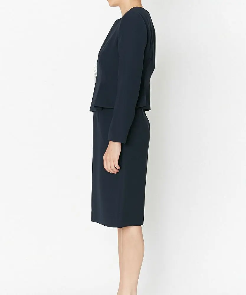 軽やかな素材を使用した定番型のノーカラージャケットにパールをあしらった上品で華やかな印象の一着。同素材のドレスやボトムスと合わせてセットアップでお召し頂けます。