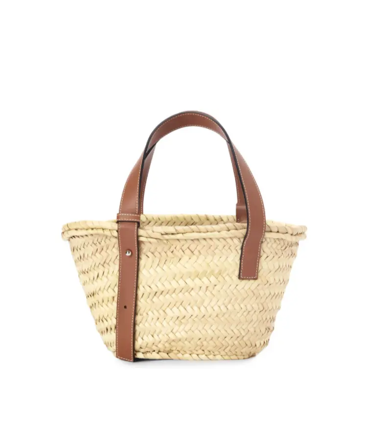クラシックな手織りのボディに、カーフのトップハンドルをあしらった伝統的なバスケットバッグ。 ヤシの葉とカーフで作り上げられたスモールジバージョン。