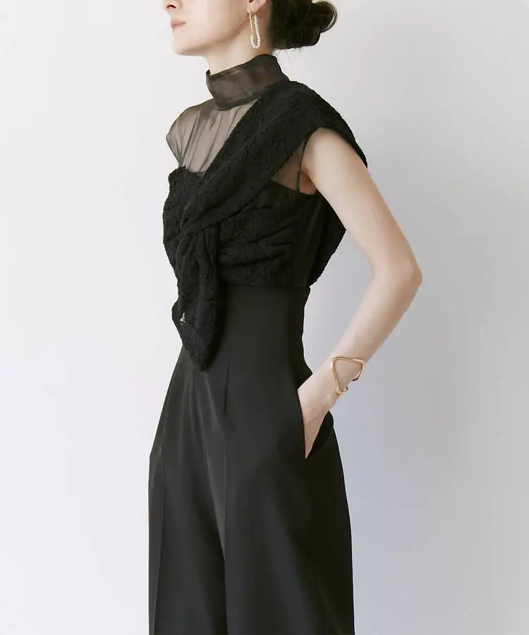 胸元でツイストされたレース素材のリボンがアシンメトリーにアクセントになったパンツドレス。