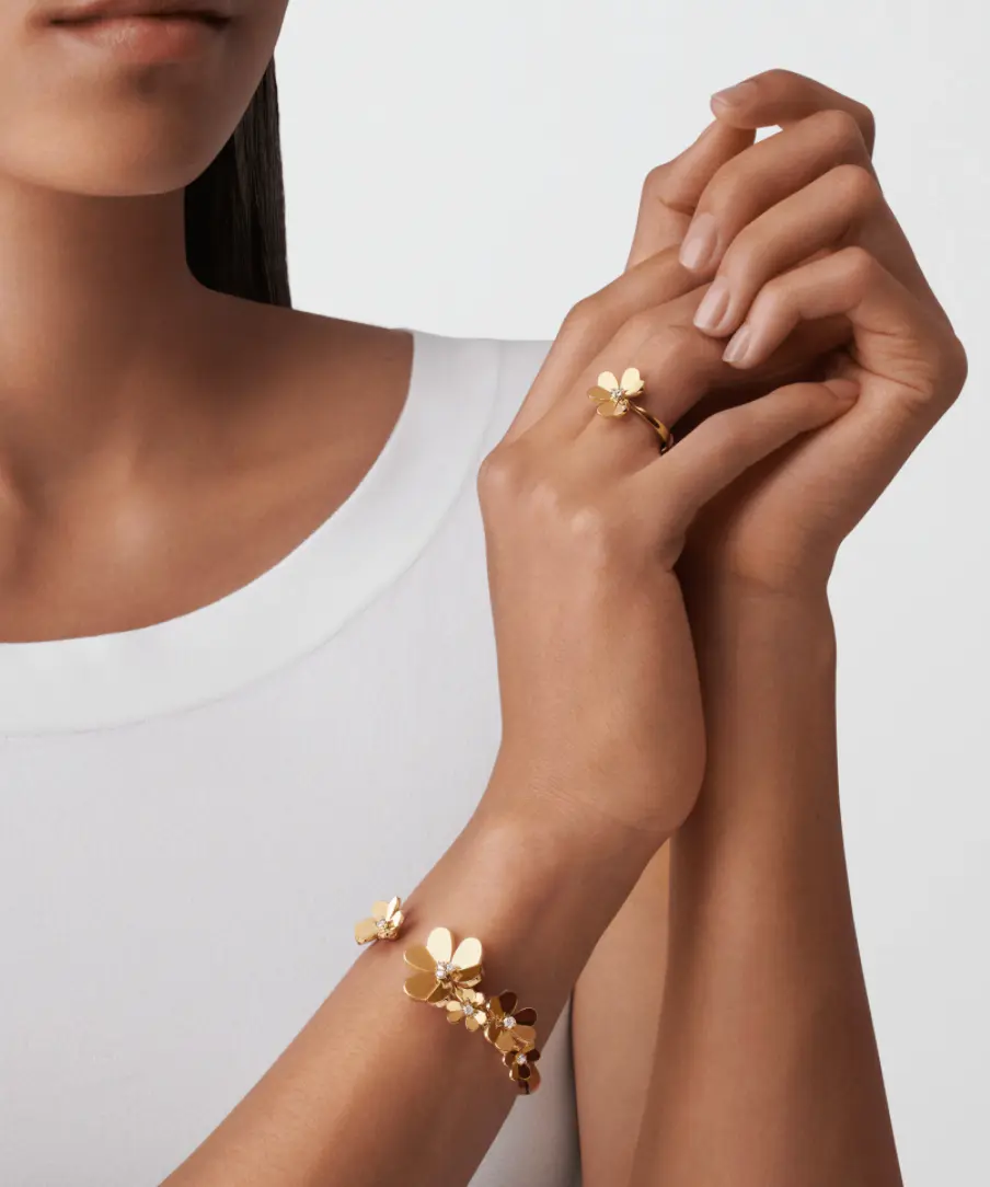 そよ風の中で花々が踊るように、グラフィカルに、軽やかに輝くヴァン クリーフ&アーペルのフリヴォル コレクション。立体的なハート形の花びらに、鏡面仕上げのゴールドやダイヤモンドがまばゆい輝きを与えます。