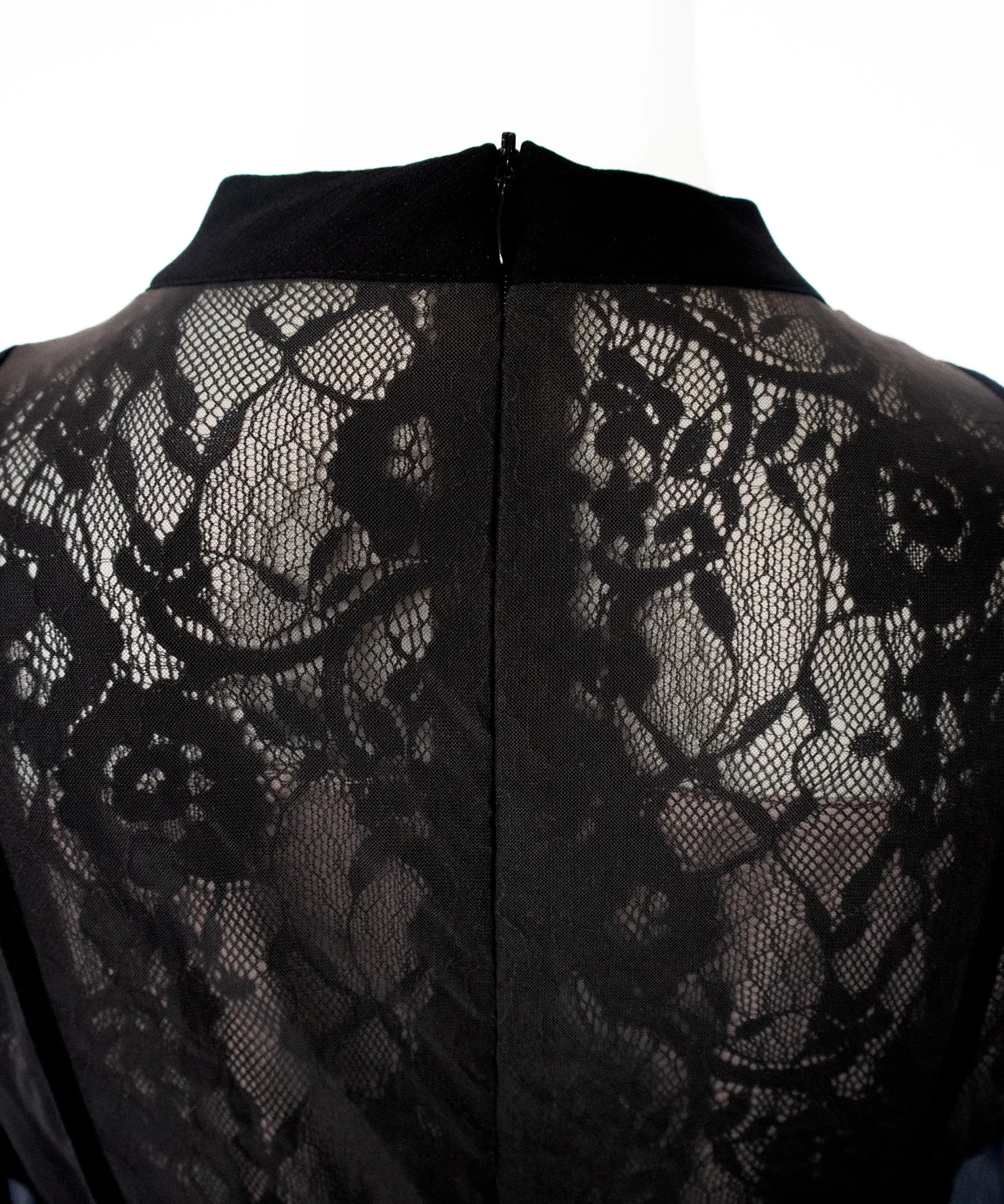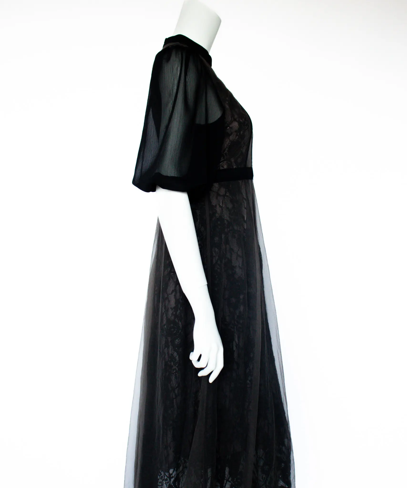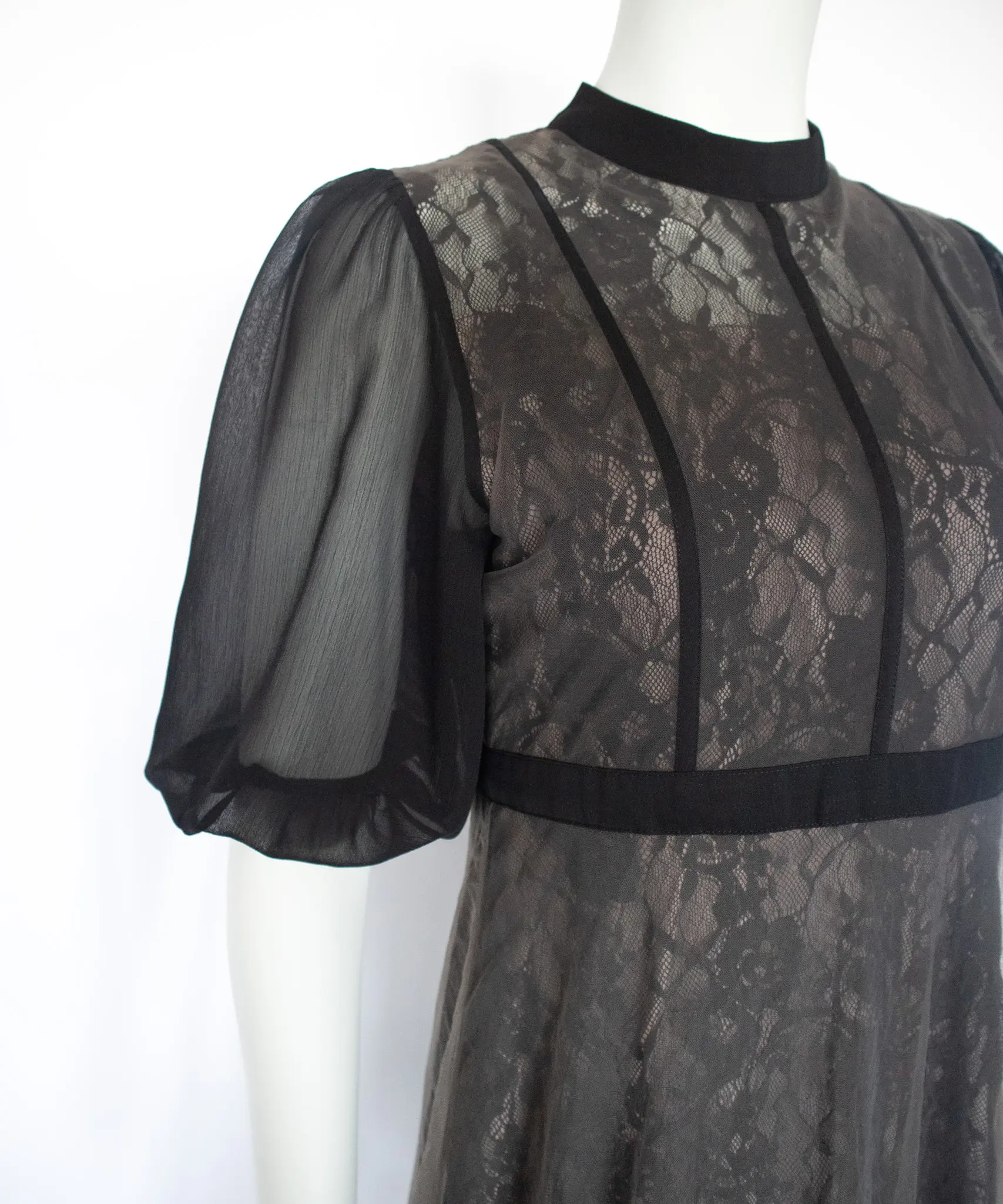 花柄とチュールのプリッツが特徴のハイウエストチュールレース切り替えドレス