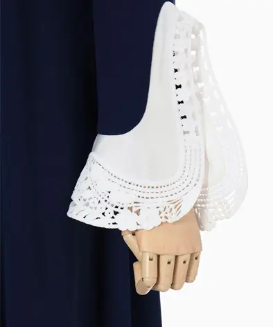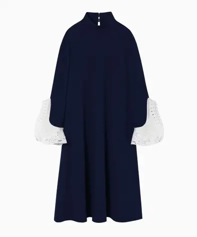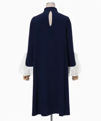 ハイネックの襟元が首元をノーブルに演出し、丸みのあるフォルムが魅せるコントラストは、全身を美しく縁取りながらすっきりと潔い胸元を作り出す。繊細かつダイナミックな刺繍が印象的なカフスとエレガントに広がるフレアの裾が装いをドラマティックに演出する。キッズドレスとお揃いのスタイルで、モダンなペアルックも完成する。