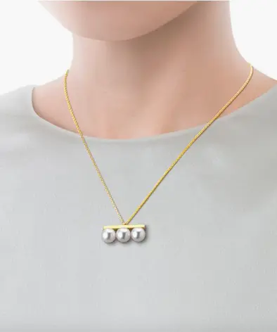 フォーマルな印象のパールを、より多くの人にカジュアルに楽しんで頂きたいという「バランス」シリーズの根底に流れる想いを新たな形で昇華させた「バランス ネオ」シリーズ。直線のバーの上に並べた3珠のパールが胸元に新感覚のエレガンスをもたらすペンダントです。程よい長さのチェーンは普段使いに最適です。