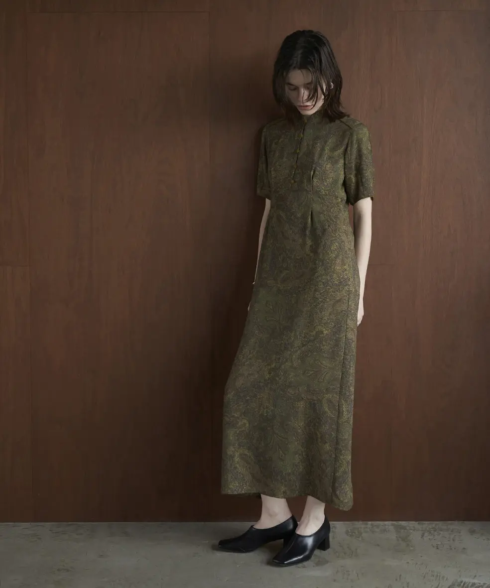 ヴィンテージのゴブラン織りを軽やかな素材にプリントで表現したCLANEオリジナル柄のワンピース。