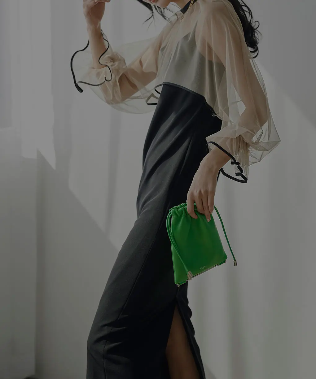 Iラインの美シルエットなドレスと、シアーなチュールトップスの相性が抜群。