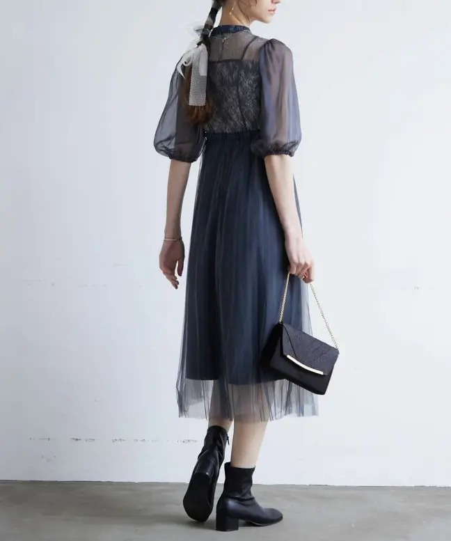 見頃の繊細レース・袖のシアーなオーガンジー・スカート部分のチュールと異素材組み合わせがおしゃれな1枚。