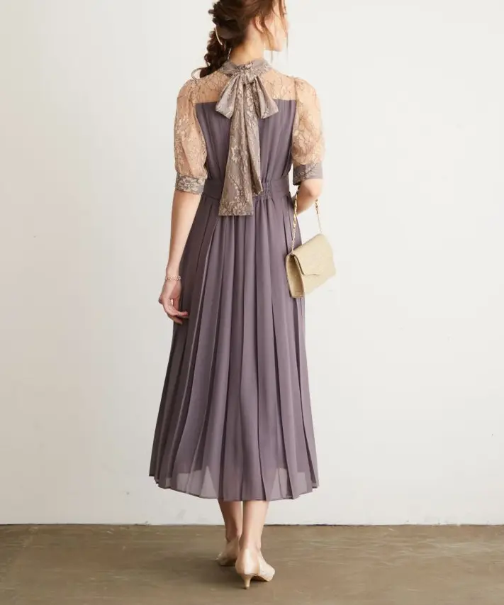 首元のバックリボンは、後ろはもちろんフロントで結んでいただくことも可能となっており、結び方によって色々なアレンジを楽しんで頂けます。