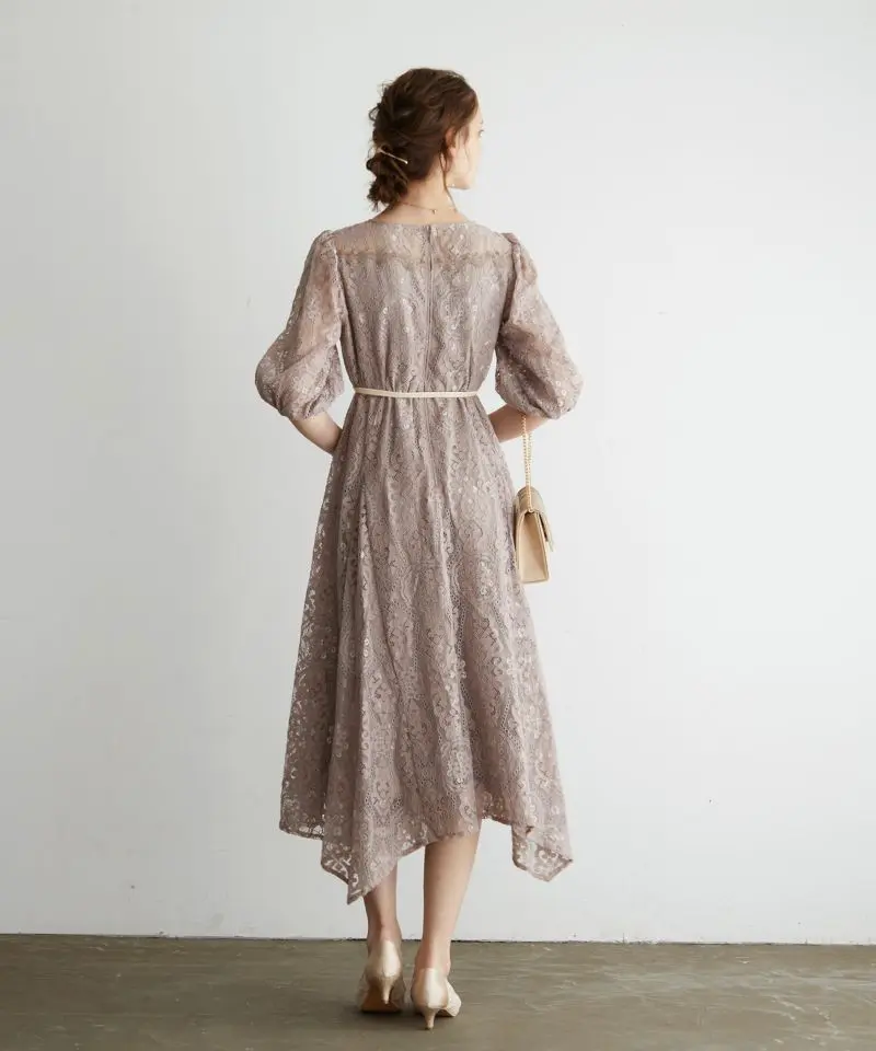 デコルテのレース使いやイレヘムデザインでオシャレ感もアップ。