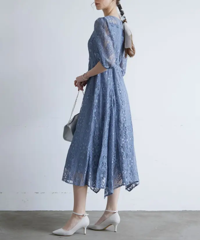 デコルテのレース使いやイレヘムデザインでオシャレ感もアップ。