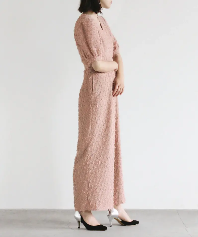 デザイン自体はシンプルですが、毛足が長いジャガード素材が、とびきり華やかな印象を与え、オリジナリティある着こなしを演出します。