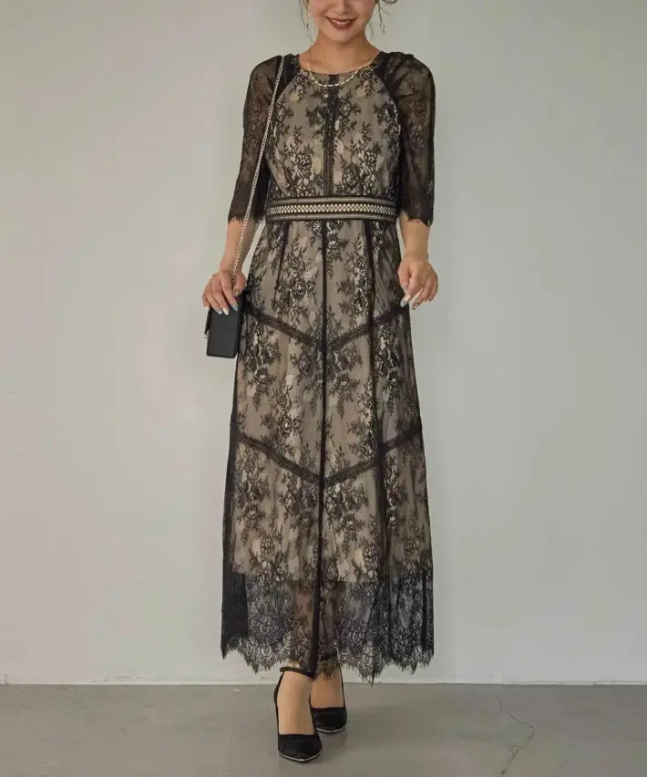 ナローラインでほっそりと見せてくれ、都会的でこなれた印象に。スタイルアップ効果も抜群です。大人っぽく着こなせる、上品な総レースドレスです。
