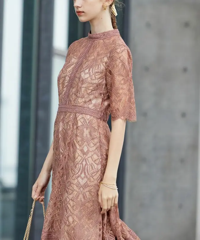 総レースのドレスで可愛らしさに、襟元のハイネックがモード感をプラス。ジャケットやボレロ要らずの袖付きが嬉しいポイント。