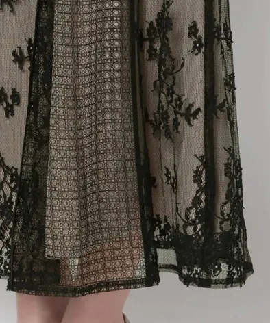 レースを2種類組み合わせ、サテンのパイピングがモダンなアクセントを加えるレースワンピース。