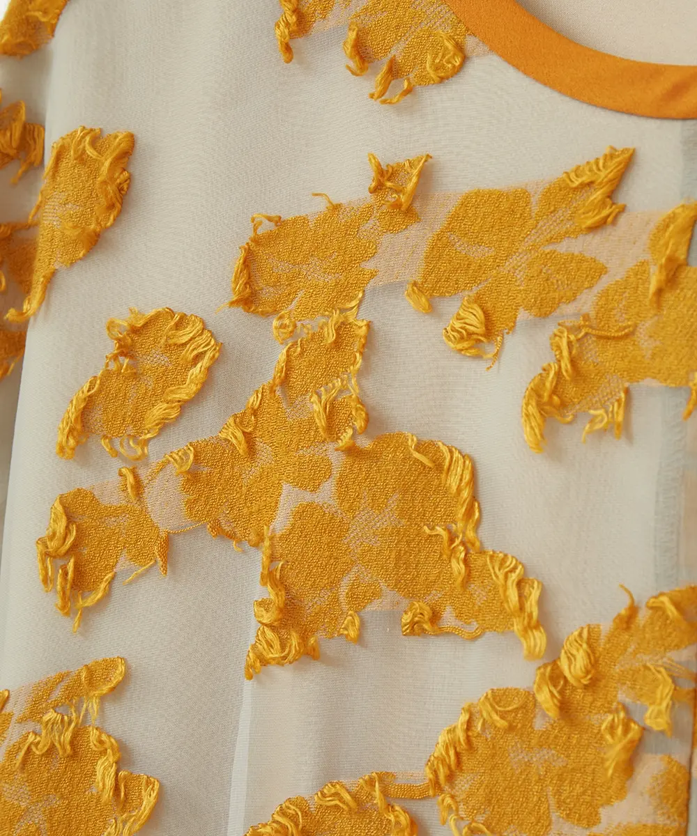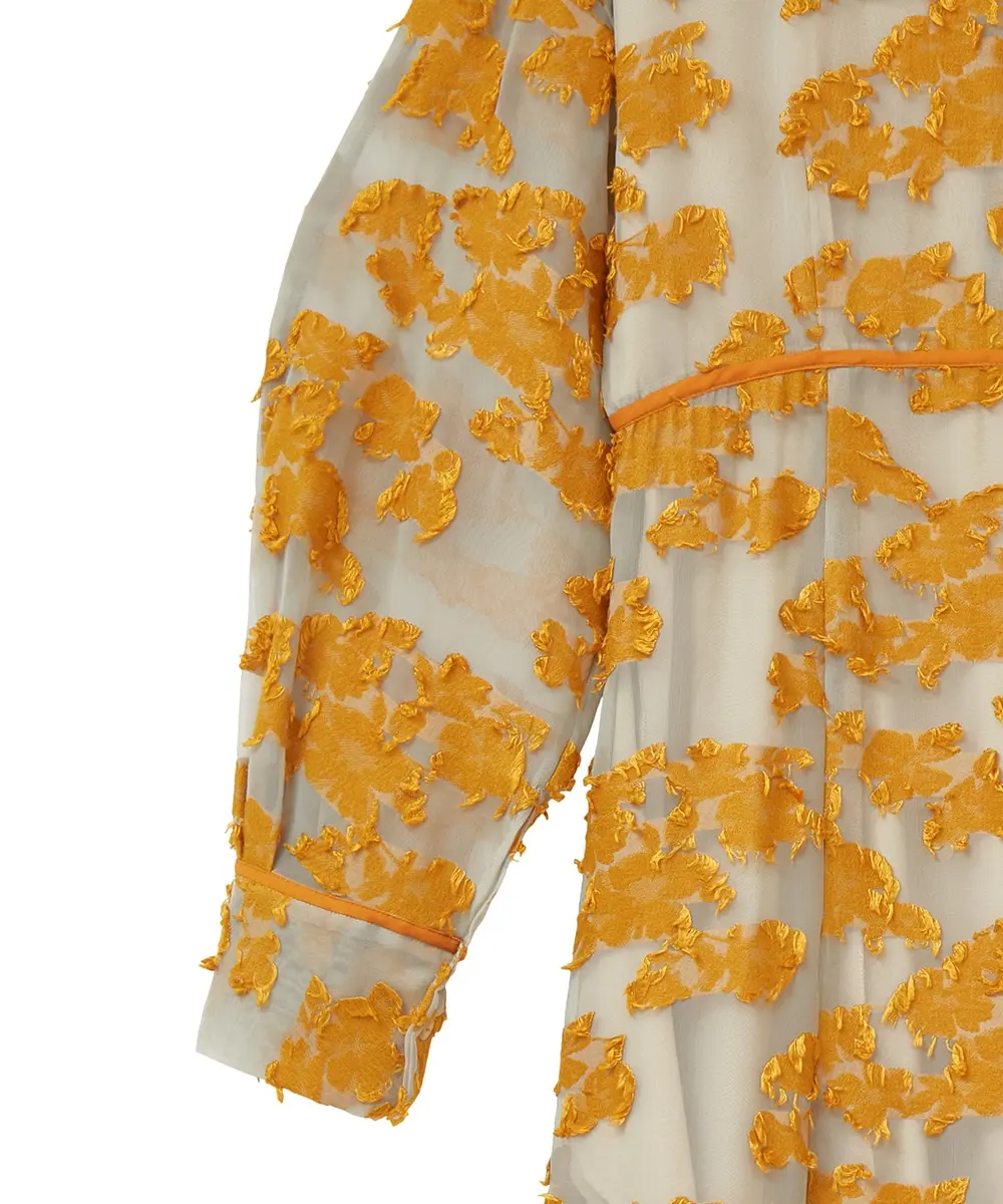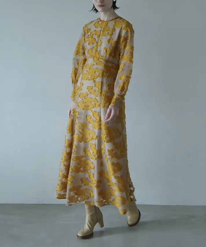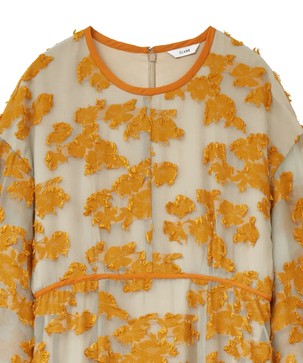 <CLANE>オリジナルのカットジャガードのワンピース。上品な程よい透け感の生地にフリンジのようなカットジャカードを施しました。表情豊かに流れるような花柄で、1枚で映える<CLANE>らしいデザインです。スッキリした腰回りが女性らしく、高めの位置の切り替えでスタイル良く見せてくれます。オケージョンにもおすすめです。