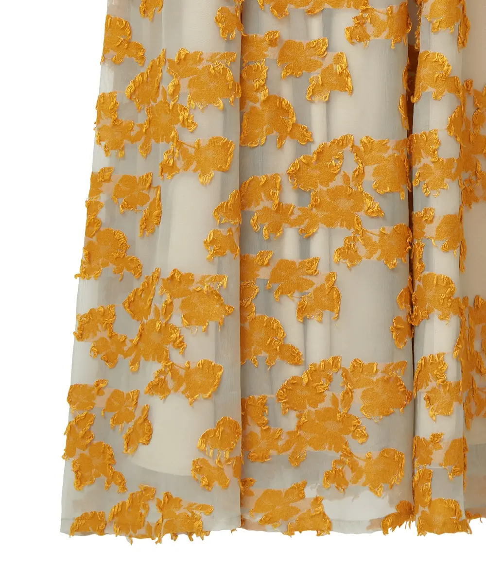<CLANE>オリジナルのカットジャガードのワンピース。上品な程よい透け感の生地にフリンジのようなカットジャカードを施しました。表情豊かに流れるような花柄で、1枚で映える<CLANE>らしいデザインです。スッキリした腰回りが女性らしく、高めの位置の切り替えでスタイル良く見せてくれます。オケージョンにもおすすめです。
