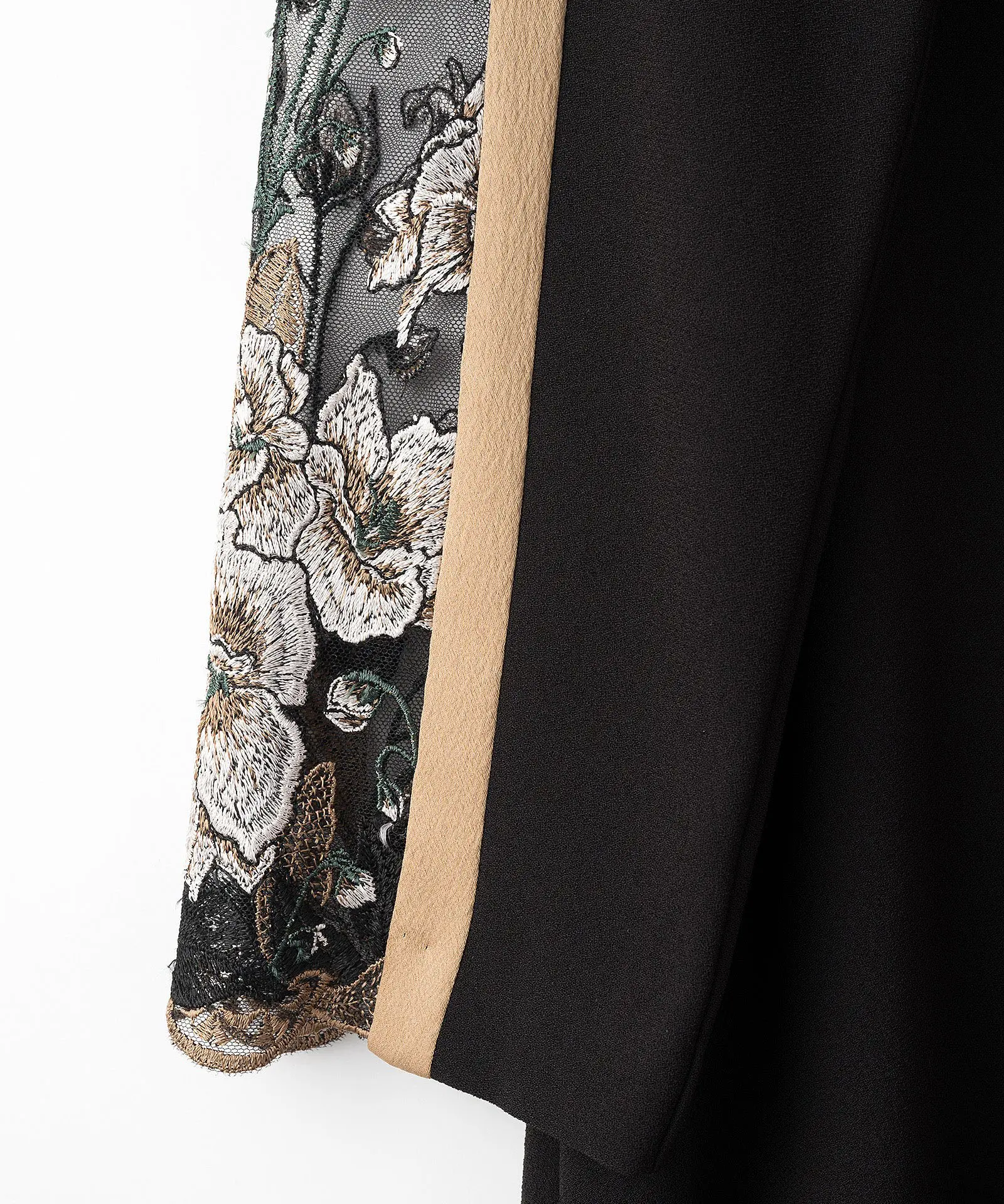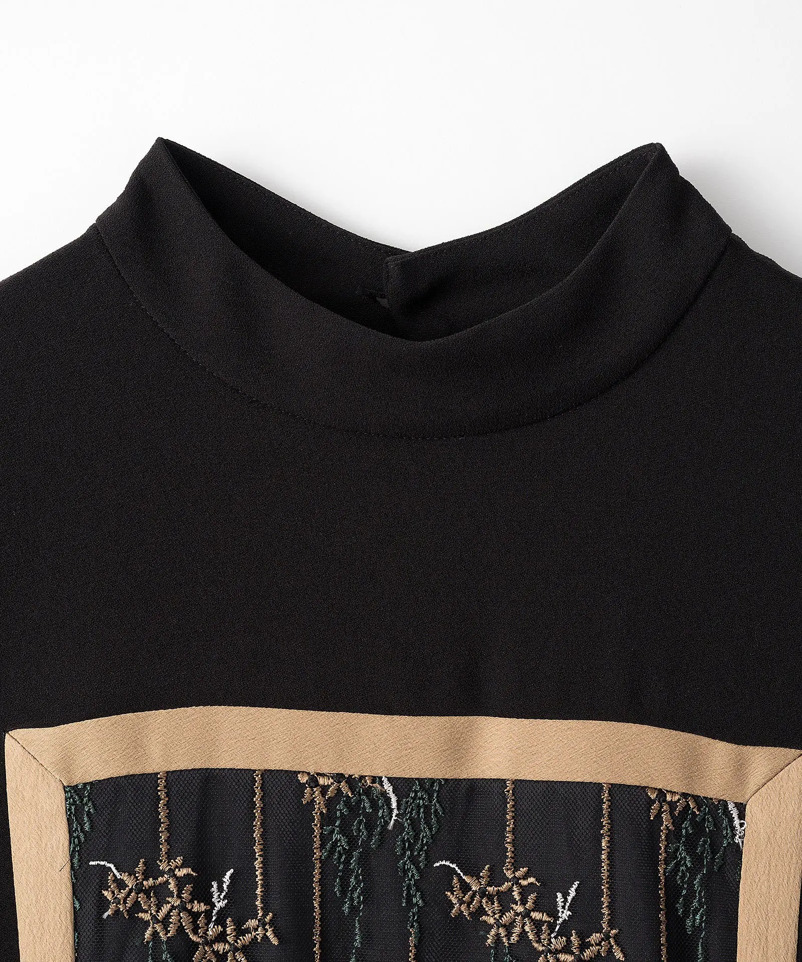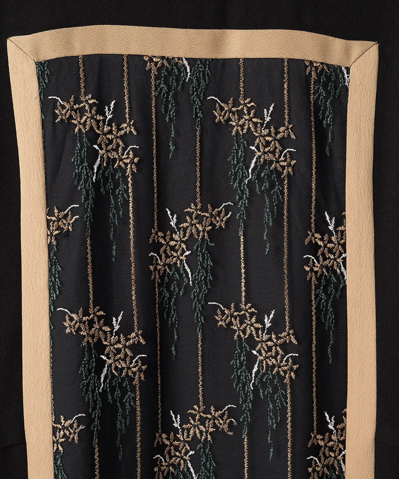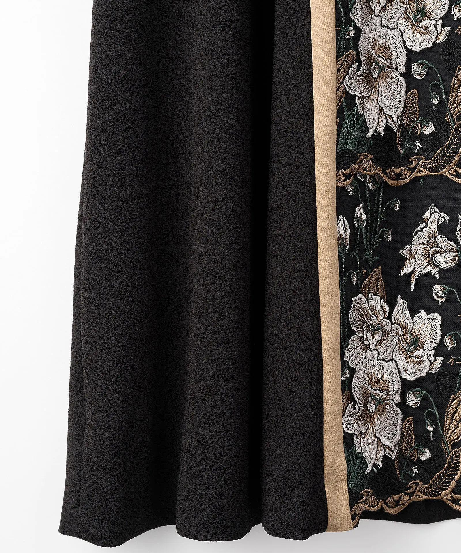 MURRAL定番の贅沢な一枚で、オケージョンシーンにも最適なアイテム。裾に向かってフレアに広がるややAラインのゆとりのあるシルエットです。フレームのデザインが全体にシャープな印象に。レース部分は土台生地があり、さらに総裏地がついています。