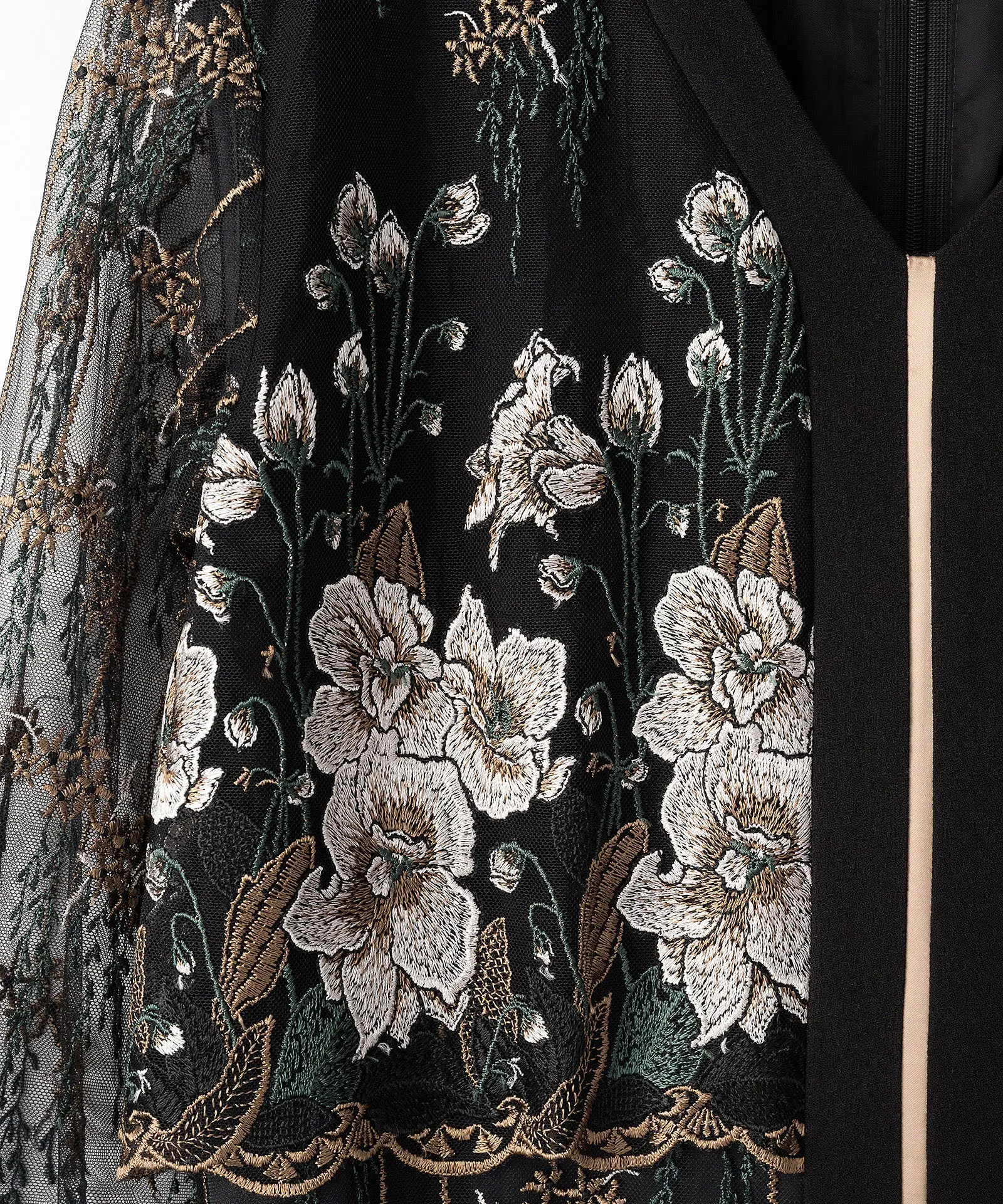 身頃部分のレース下は土台生地があり、さらに総裏地がついているためインナーを選ばない作りになっている。