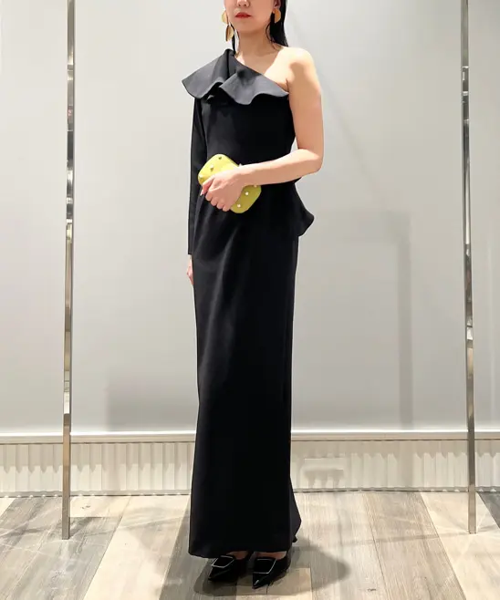 顔回りを華やかに演出し、前後でフリルのデザインが違い、360度美しいシルエットのドレスです。ストンとしたストレートシルエットですがウエストのくびれ位置がやや上のためスタイルアップ効果が抜群です。後ろにはスリットが入っているため足さばきも◎