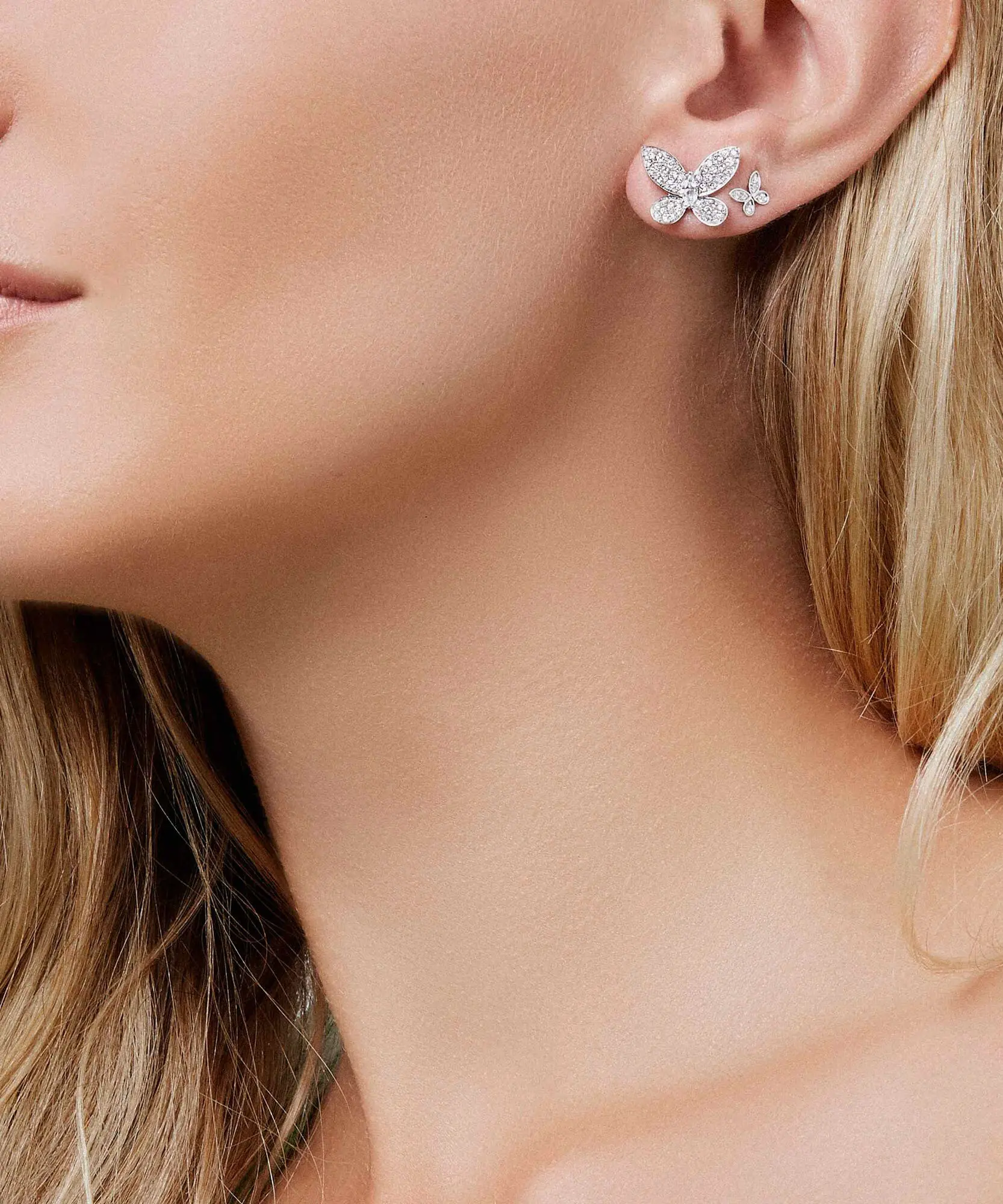 パヴェダイヤモンドが繊細に煌めくプティ パヴェ バタフライ ダイヤモンドスタッズは、デイリーにお楽しみいただけるアイテムです。バタフライはグラフのアイコニックなモチーフであると同時に、デザイナーたちにとってのクリエイティビティの源であり続けました。私たちはその繊細で優美なバタフライを最高峰のダイヤモンドで表現できることに、この上ない喜びを感じています。