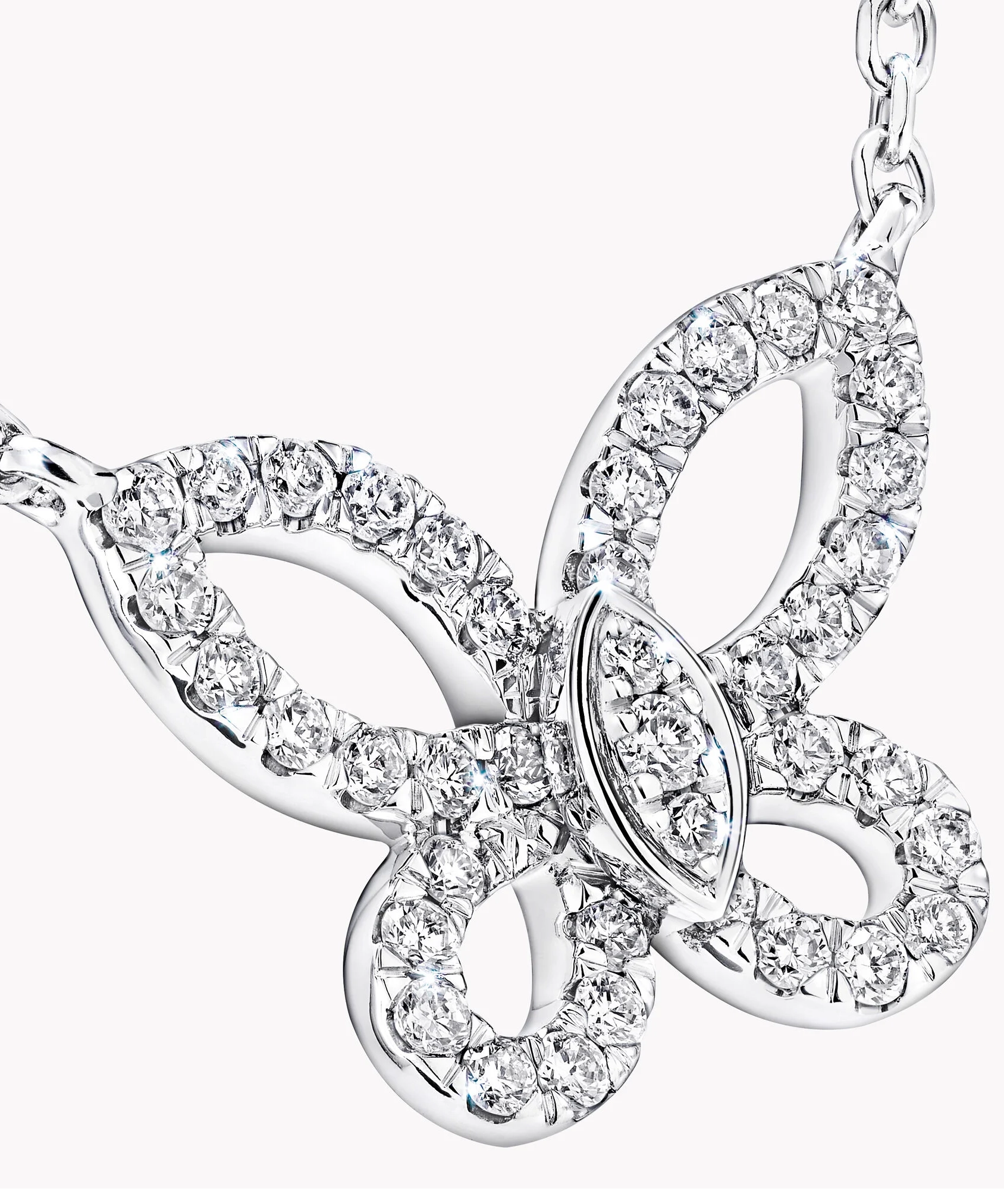 自然界の最も美しい創造物であるバタフライの可憐なシルエットを、上質なパヴェダイヤモンドで表現したミニ バタフライ シルエット ダイヤモンド ペンダント。繊細な輝きが引き立つよう匠の職人の手作業で丁寧にセットされたダイヤモンドのバタフライが、ホワイトゴールドチェーンの先端で優美な煌めきを放ちます。