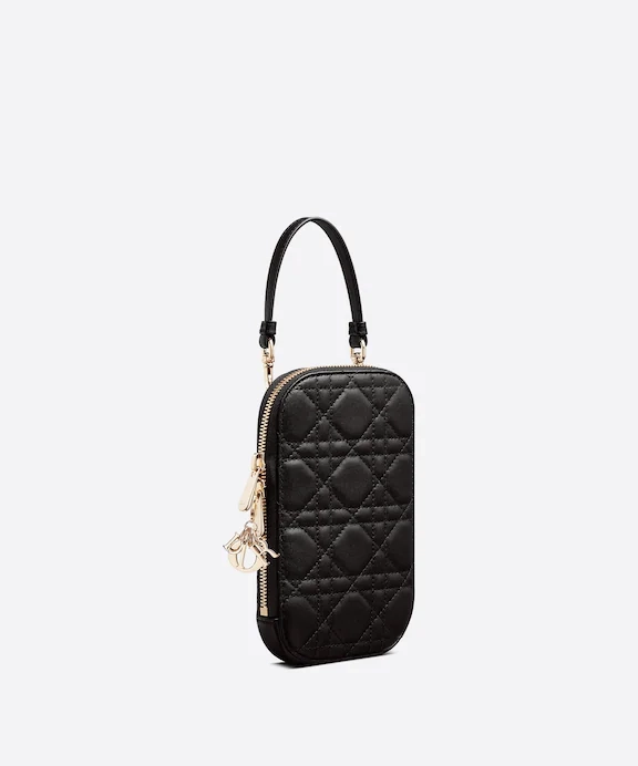 こだわりのデザインと洗練されたスタイルが魅力の「レディ ディオール」フォンホルダー。ブラックの「カナージュ」ラムスキンを使用し、取り外しが可能なD.I.O.R.チャームをあしらいました。取り外しが可能なハンドルとチェーンストラップが付いているので、手持ちや斜めがけなど、お好みの持ち方にアレンジできます。