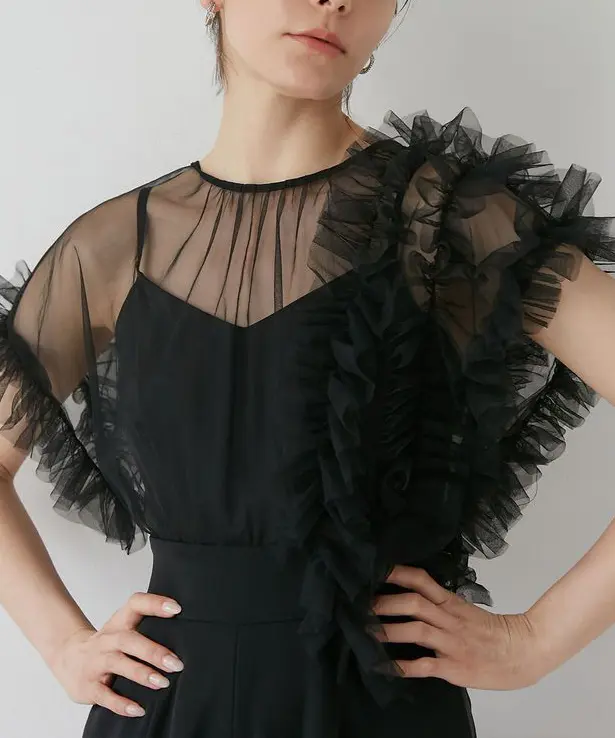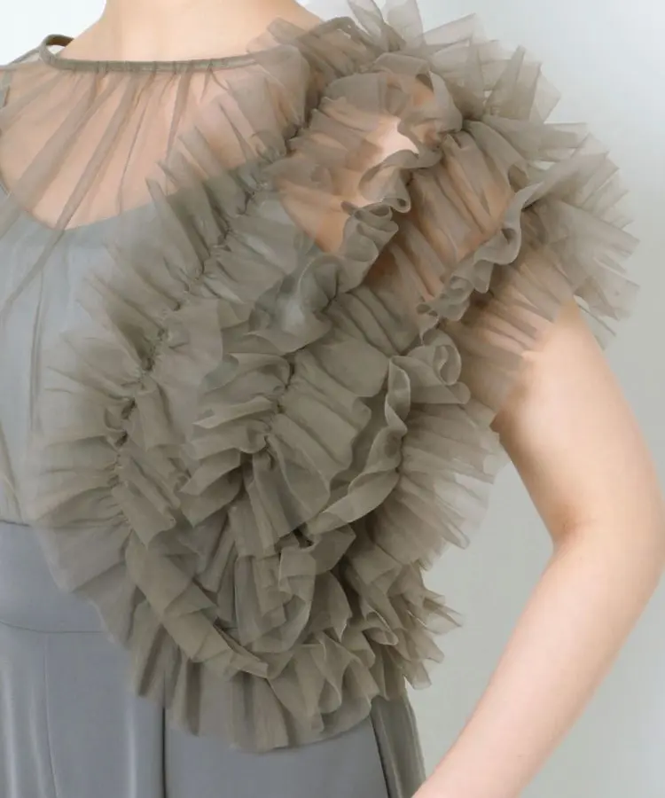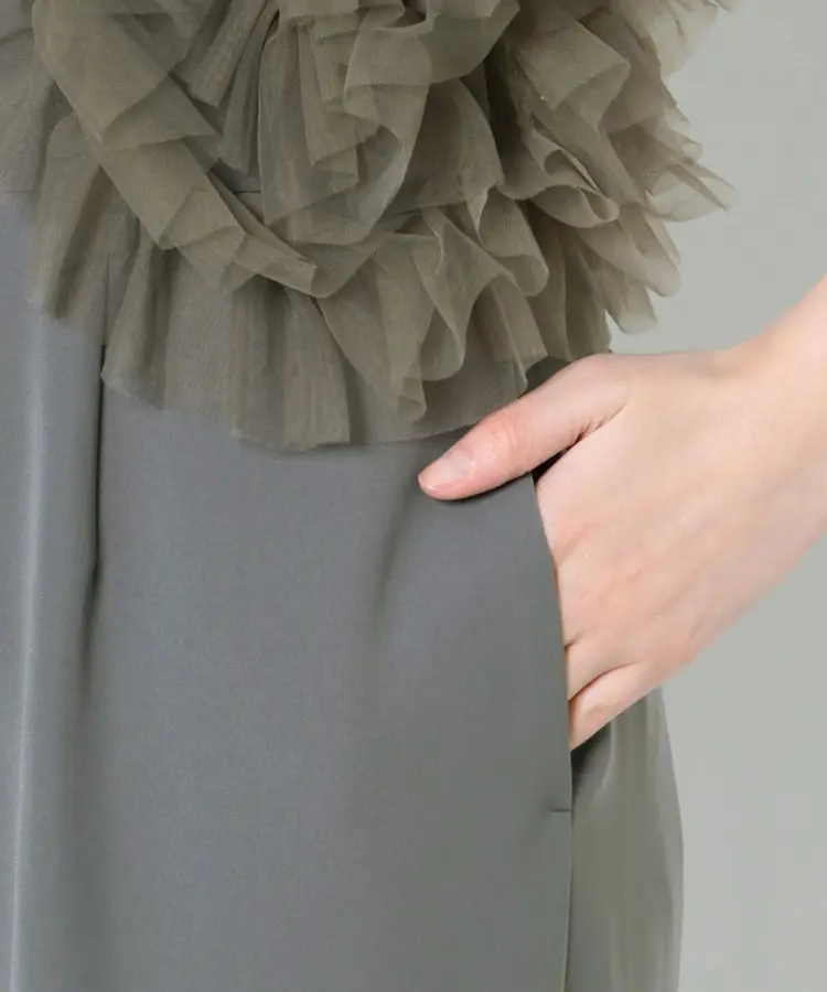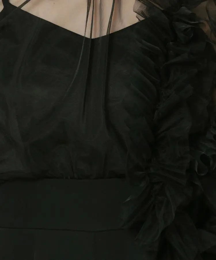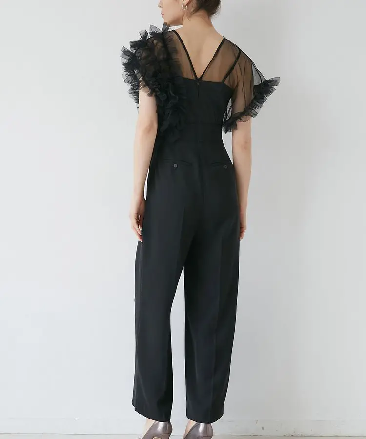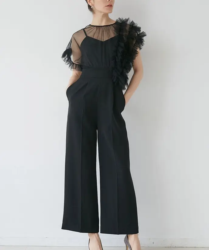チュールにたっぷりとギャザーを寄せたフリルを左右アシンメトリーに施し、洗練されたパンツドレスに仕上げました。
