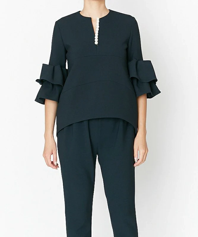 シャープな印象のスリットネックにパールをあしらったブラウス。程よい厚みとマットな質感の生地で仕立てており、袖口にはボリュームのある二段のフリルがデザインされた華やかさとクラス感が際立つ一着。