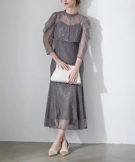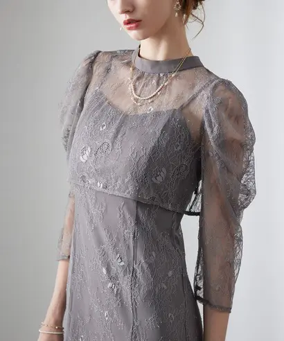キャミソールワンピースに、レースのボレロを合わせたドレス。