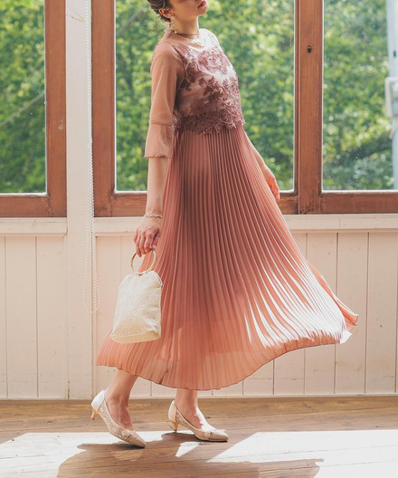 動くたびに美しく揺れる上品なプリーツスカートは、結婚式や二次会などパーティシーンにぴったり。