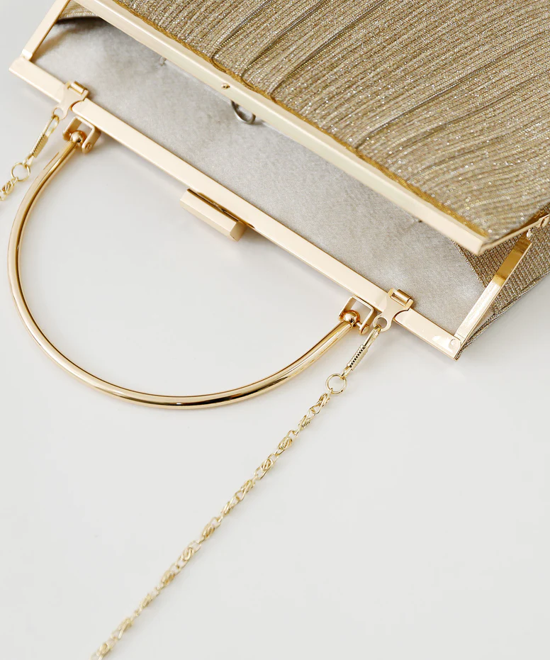 華やかな全面ラメ生地にプリーツ加工を施したがま口クラッチバッグです。