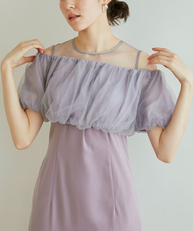胸上からシアーに切り替えたIラインワンピースに、ボリューム感のあるチュールギャザーボレロがセットになったレイヤードドレス。