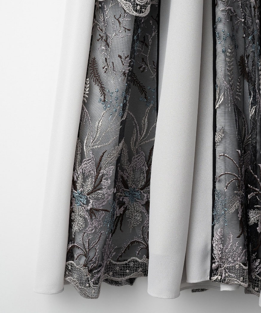 スカート部分にはエンブロイダリーレースがコラージュされたように配置されています。