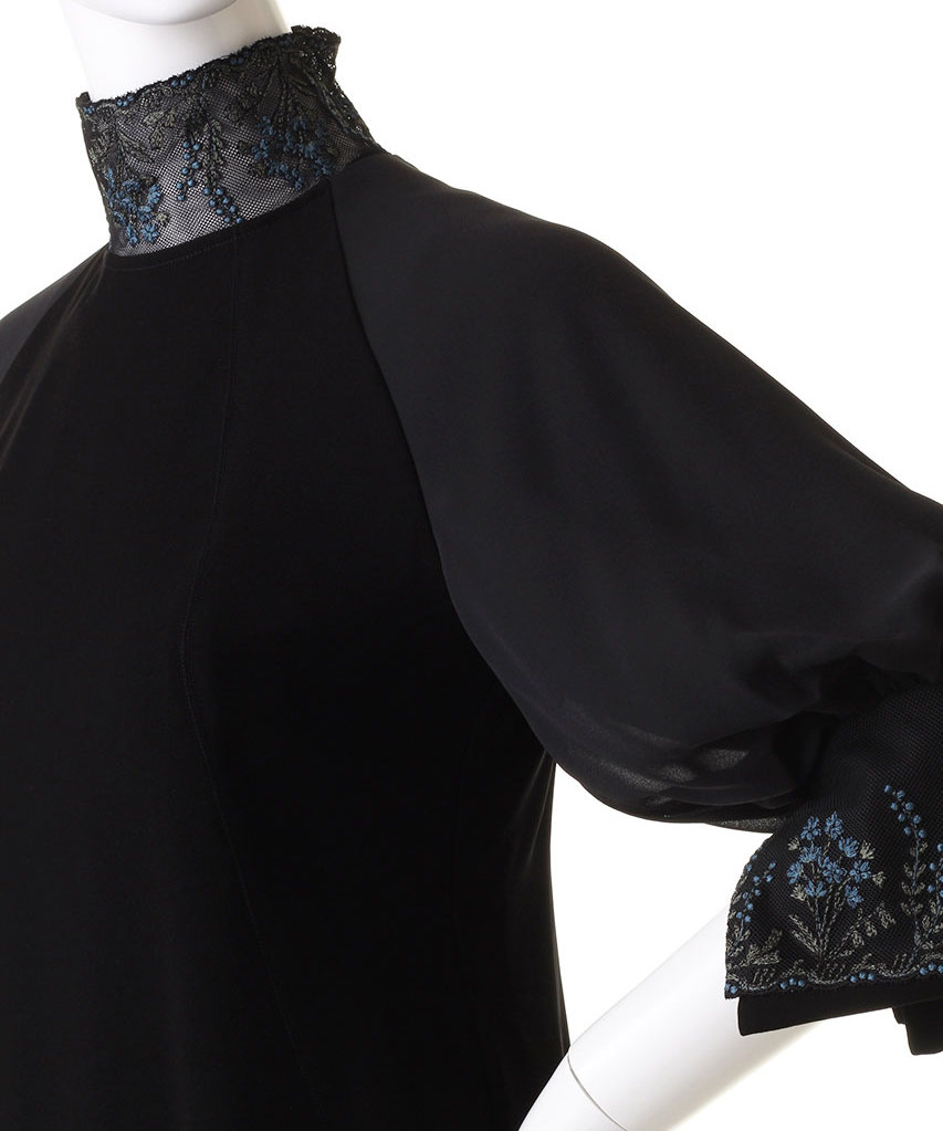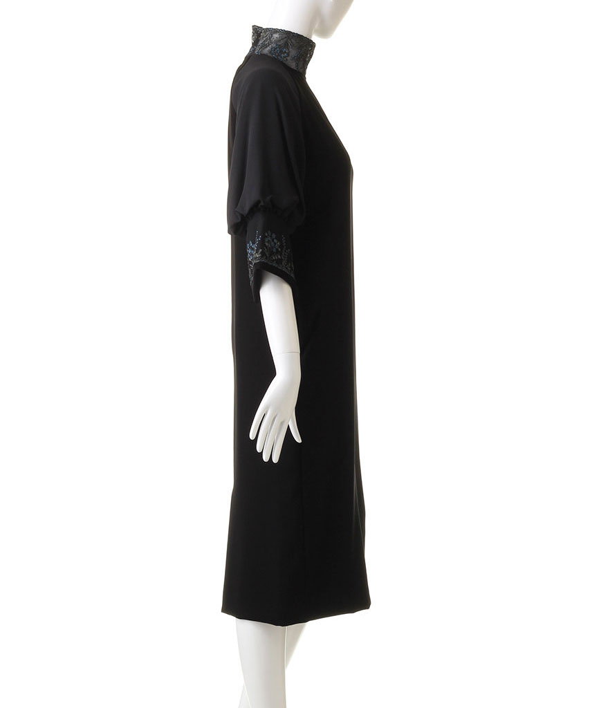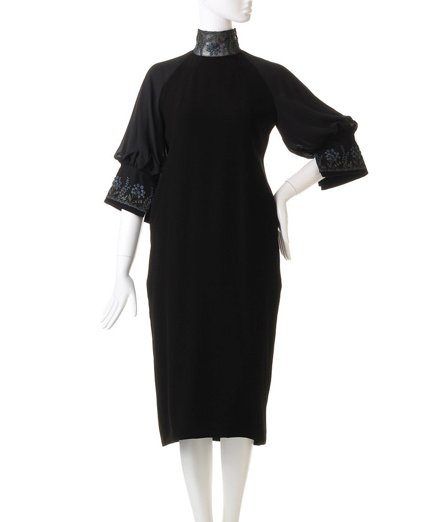 繊細なエンブロイダリーレースをあしらったミディ丈のドレス。