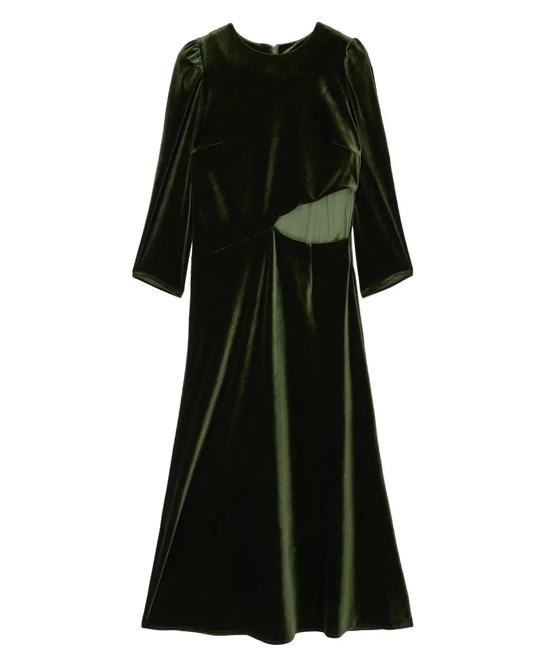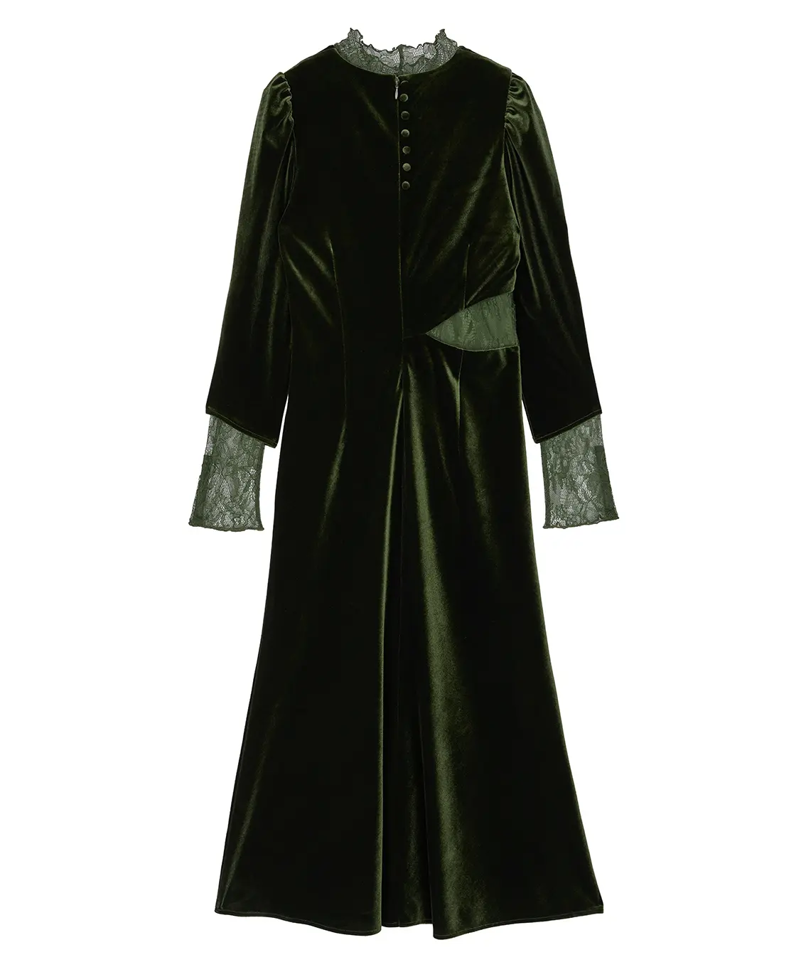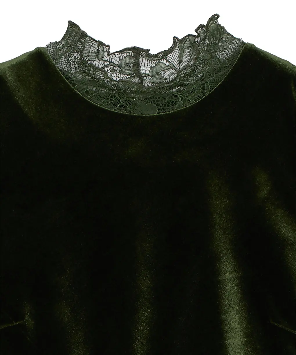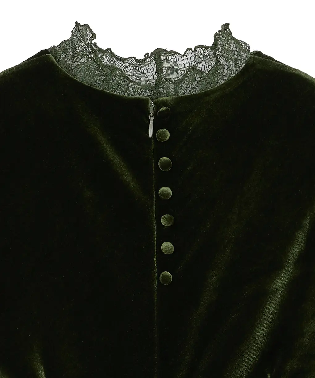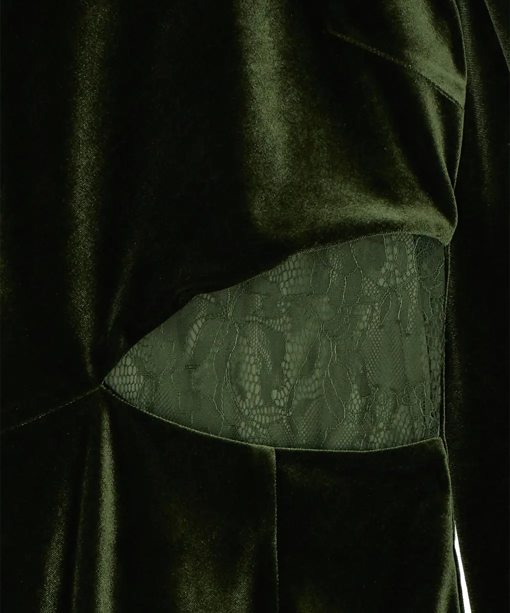 ベロアドレス・レーストップス・インナーキャミソールの3点セットのアイテムです。ウエスト部分のレースが特徴のベロアドレス。七部袖からチラ見えするレースインナーも可愛いです。キャミソールのインナーもついてるのでウエストの透け感はお好みで隠せます。ベロア部分はラメ感があります。