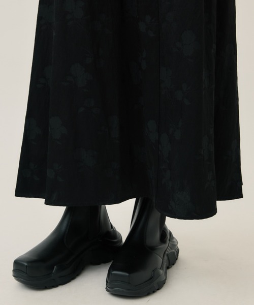 ヴィンテージのような風合いのサテン生地と花柄ジャガードが上品なワンピースです。首元のデザインが特徴的なモード感がCLANEらしいです。