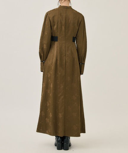 ヴィンテージのような風合いのサテン生地と花柄ジャガードが上品なワンピースです。首元のデザインが特徴的なモード感がCLANEらしいです。
