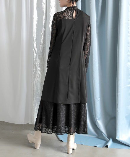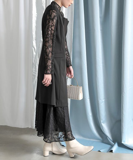 総レースが繊細なワンピースとジレがセットになったモード感のあるワンピースドレスです。ジレ部分のベルトでウエストを自由に調整することが出来ます。ジレにはポケットもついています。袖があるため二の腕をカバーしつつ、お洒落な雰囲気で、幅広い年代の方にご着用いただけます。