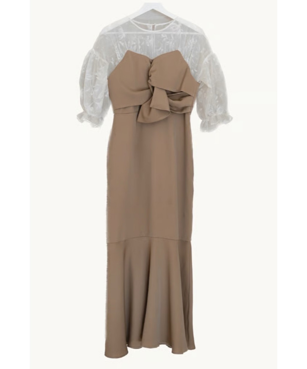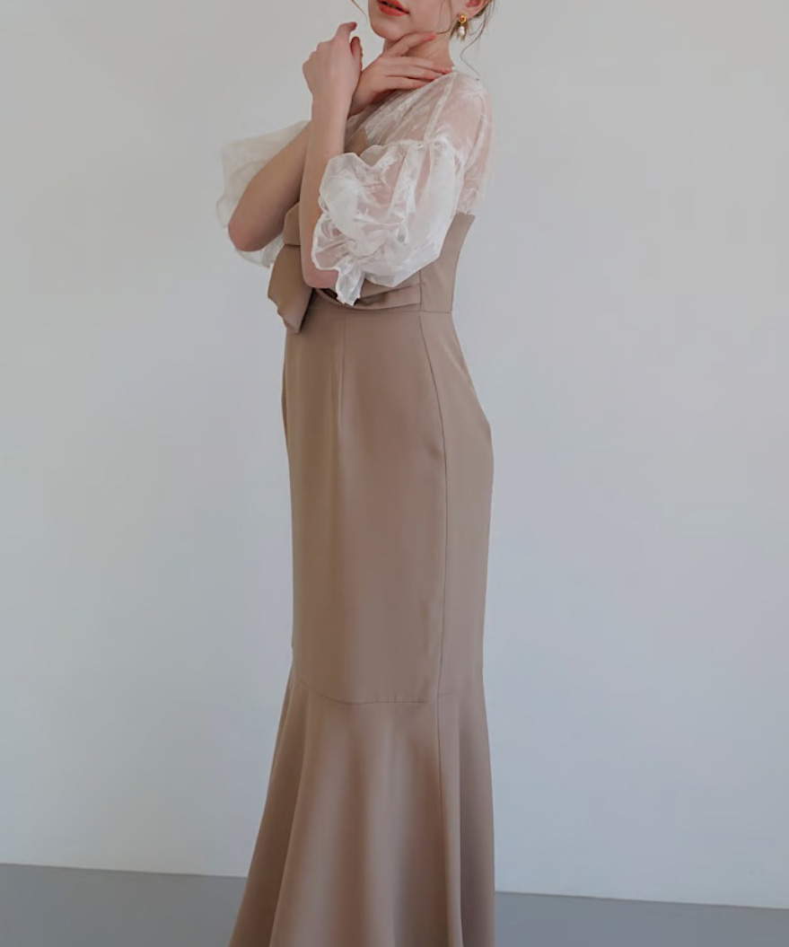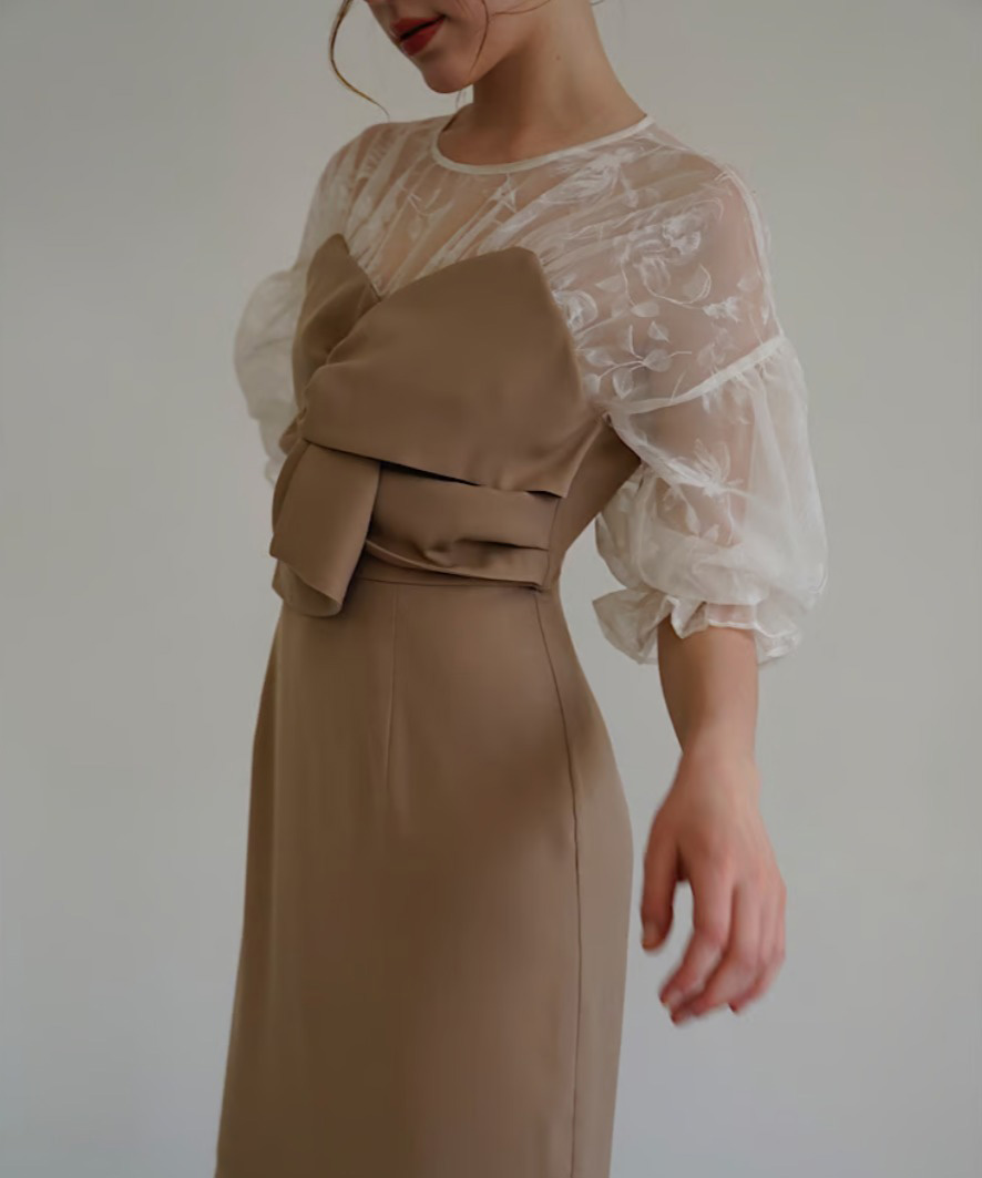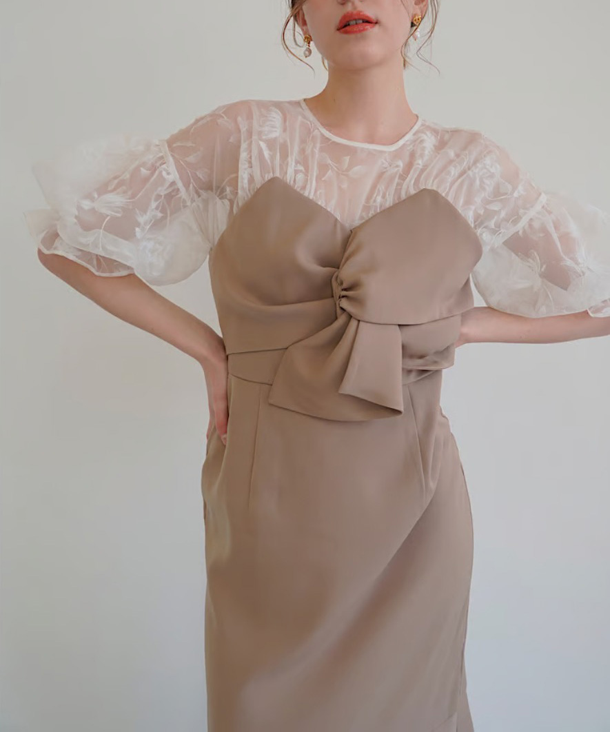 上品な透け感のある生地と組み合わせ、大人な印象に仕上がるワンピース。