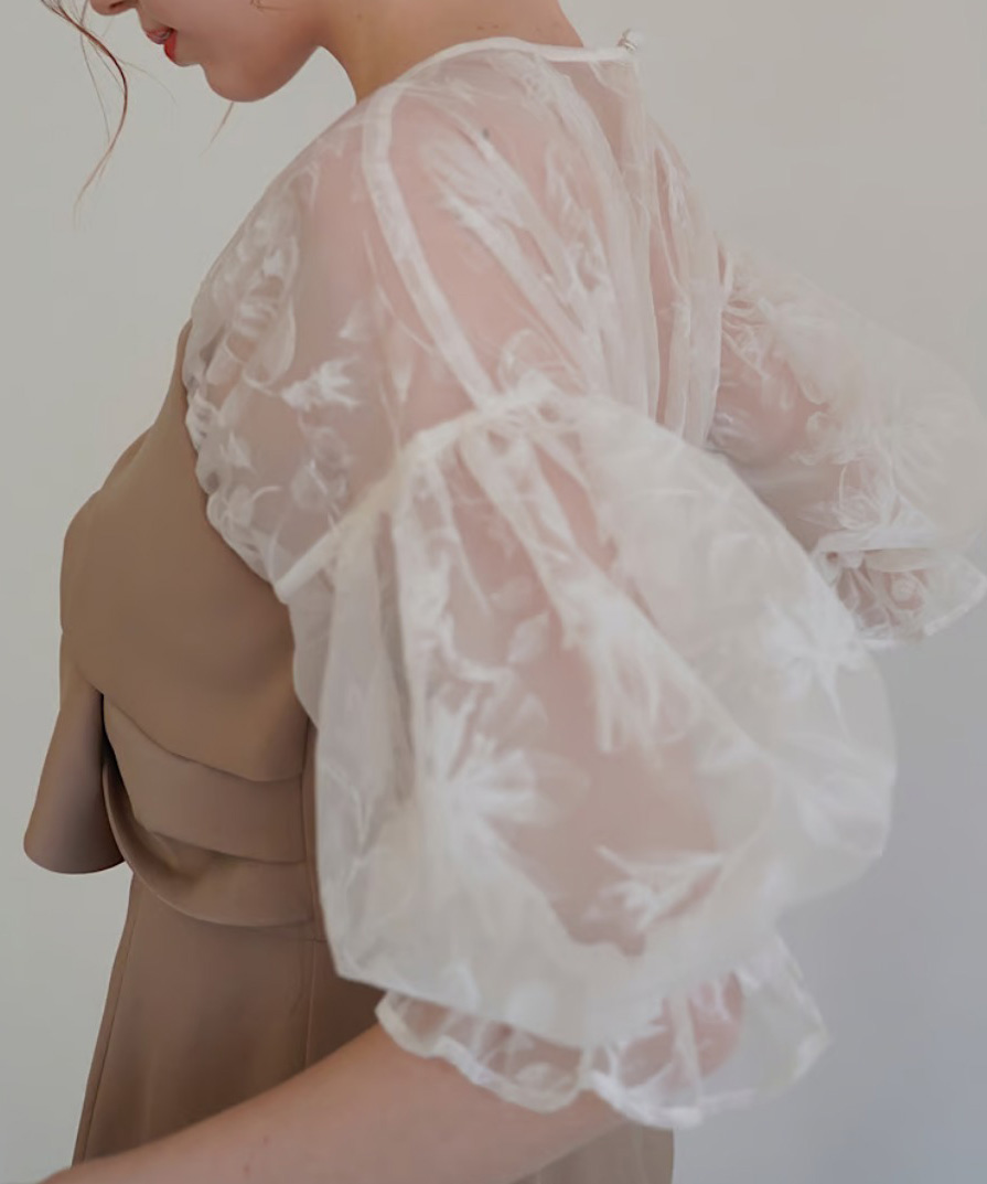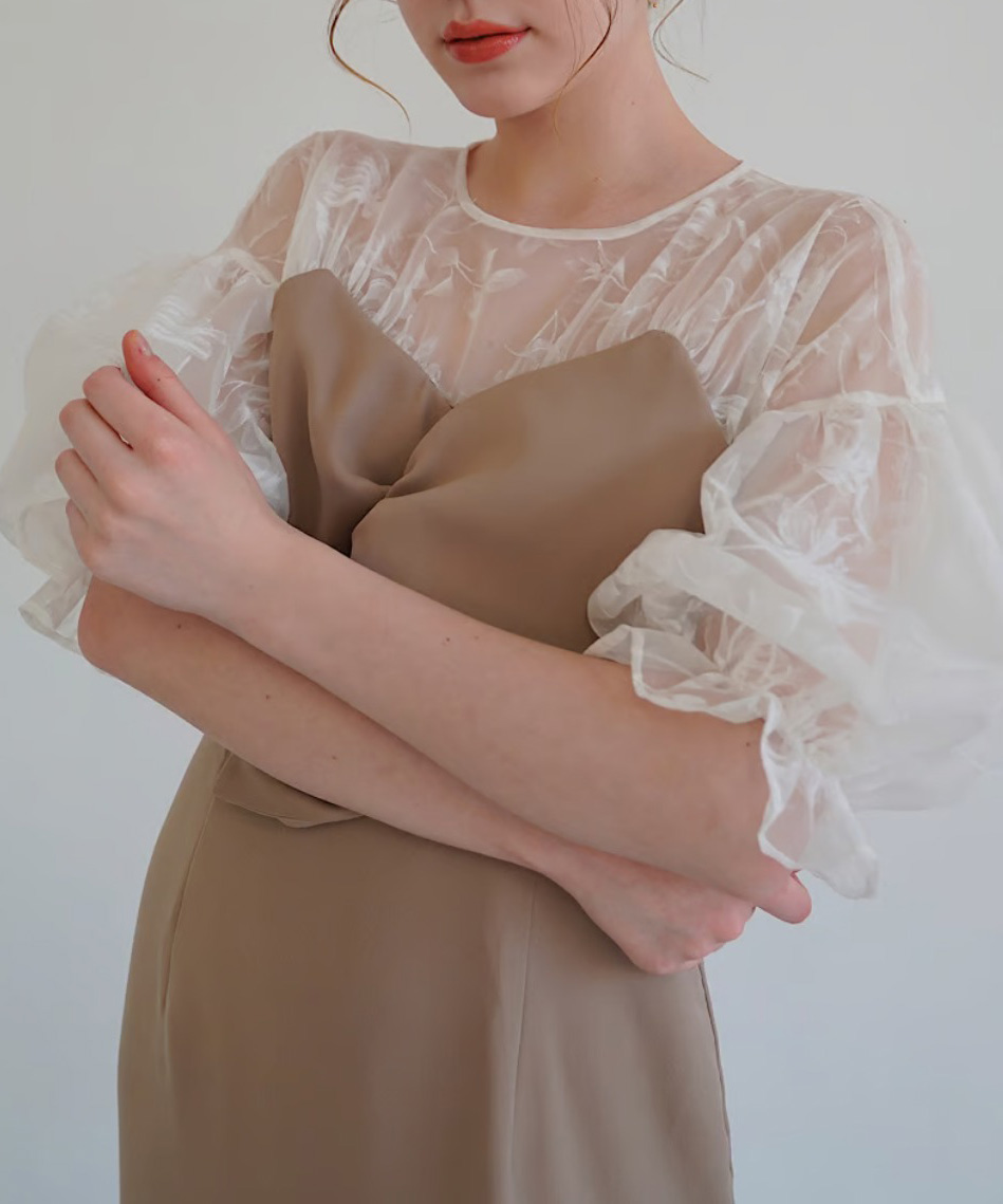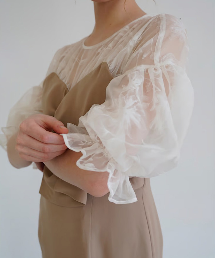 顔が華やかに見える生地と袖のパフデザインがポイントです。