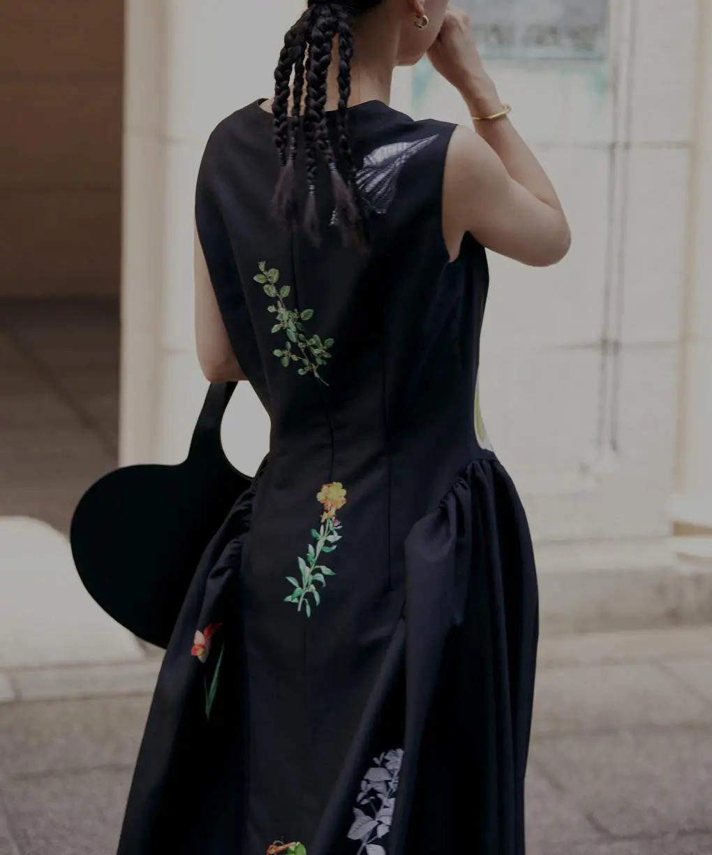 シワになりにくいリネンライクな合繊生地を使用したモチーフ柄のワンピース。