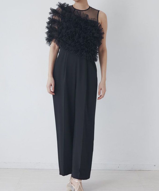 LAGUNAMOONの人気パンツドレスです。チュールのスヌードはオフショルやアシンメトリーなど数パターンで着用いただけます。華やかな結婚式などにぴったりです。