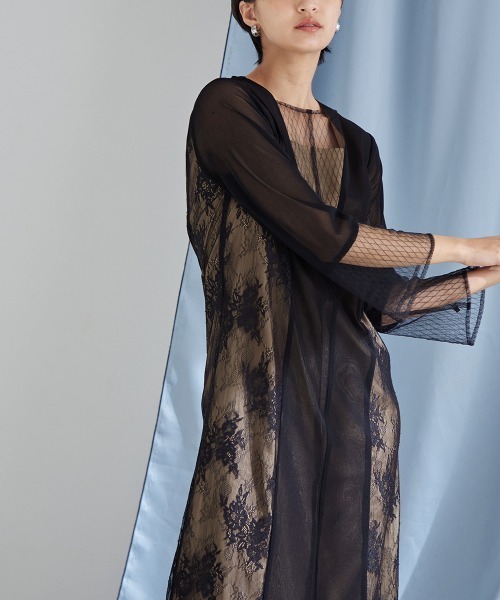 透け感のある異素材生地をドッキングしたエレガントなワンピースドレスです。Iラインのシルエットですっきりとした縦のラインを演出しているので、スタイルアップ効果があります。