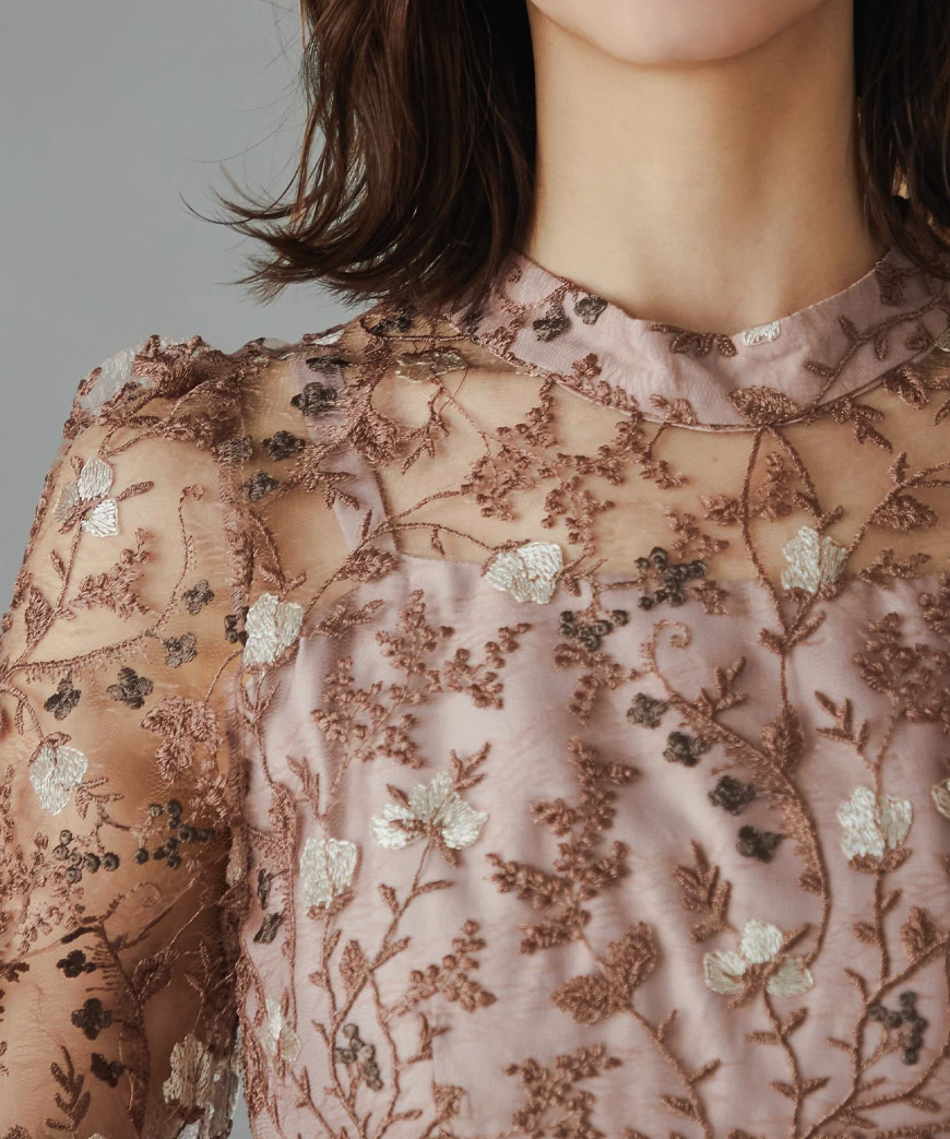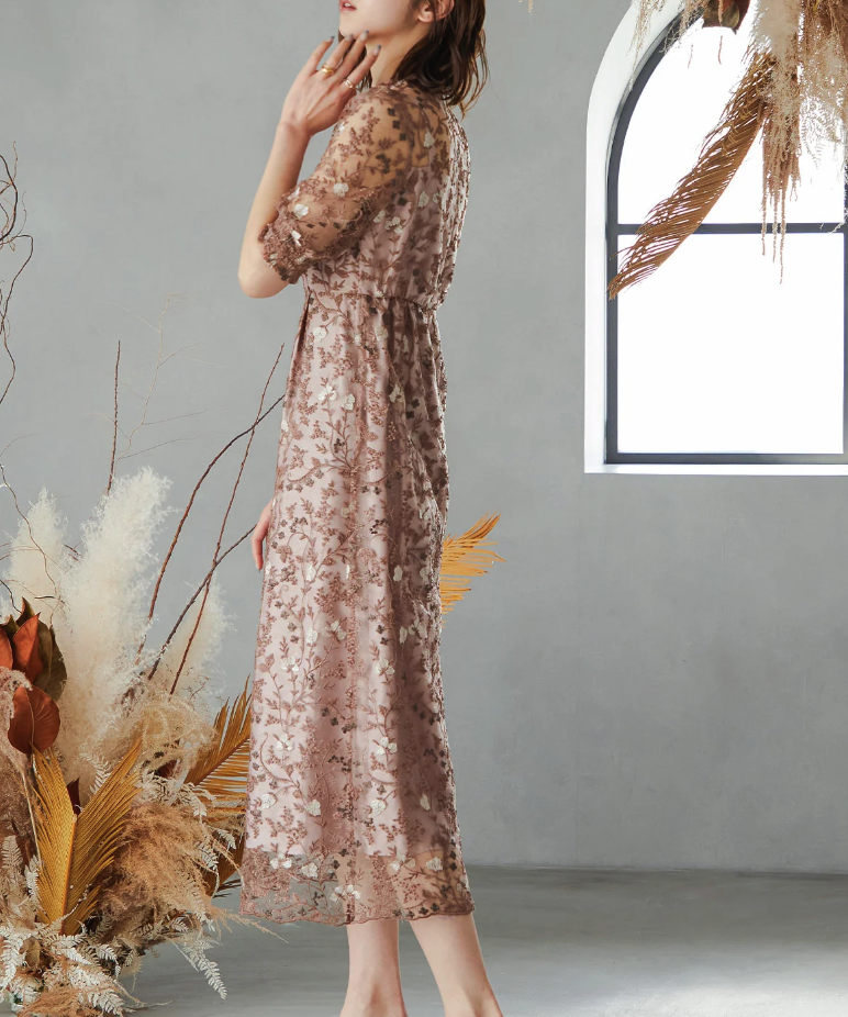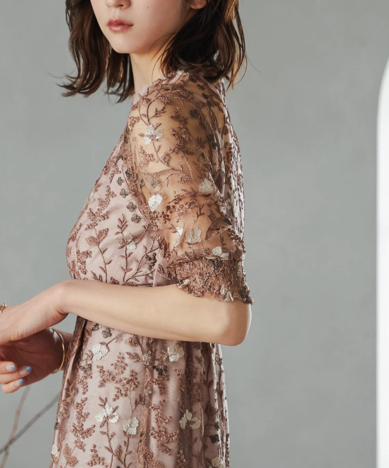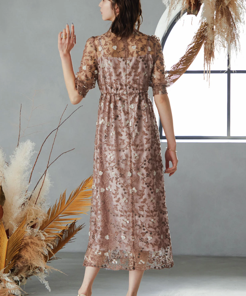 アンティーク風の手刺繍レースを全体に施した、ヴィンテージ感漂うパーティードレス。