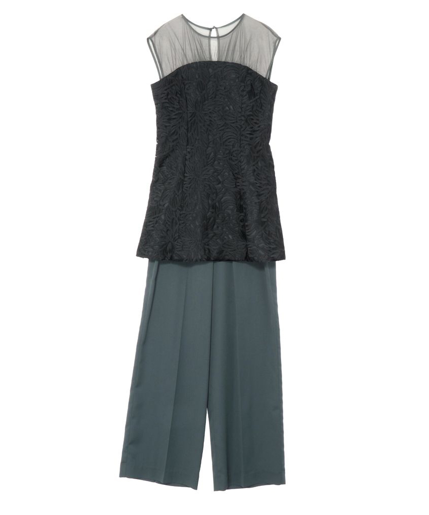 チュールレースを使用したビスチェと脇ファスナーのシンプルなセンタープレスワイドパンツのセットアップ。